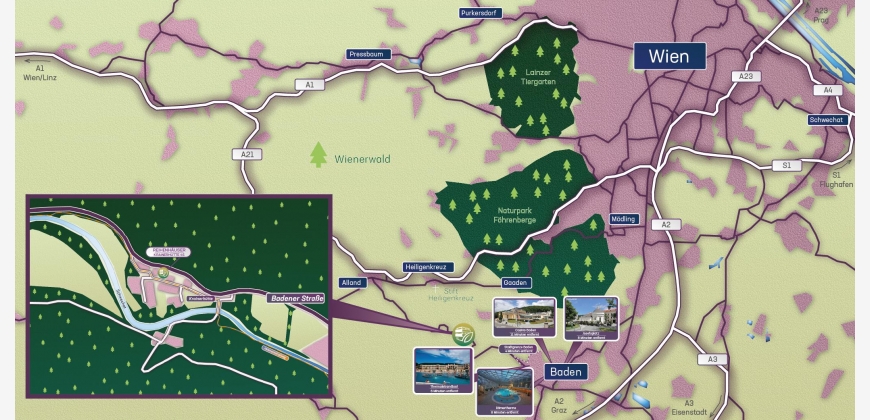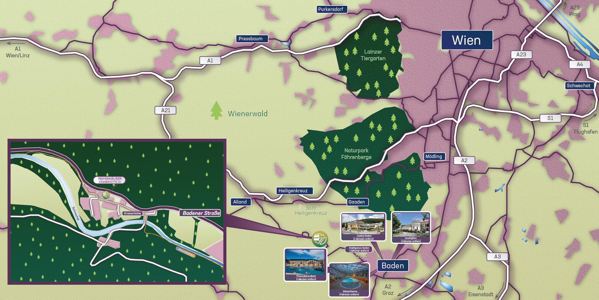 Die Architekten-Reihenhäuser liegen im Biosphärenpark Wienerwald und sind trotzdem nur 5 Autominuten von Baden entfernt. Über eine nahe Bushaltestelle kommen Sie öffentlich in einer guten Viertelstunde zum Badener Bahnhof. Die Lage direkt am Helenentalradweg, die fußläufige Lage zur Schwechat (Fluss) und die zahlreichen Wanderwege sind nur einige der Highlights dieses schönen Projekts.
