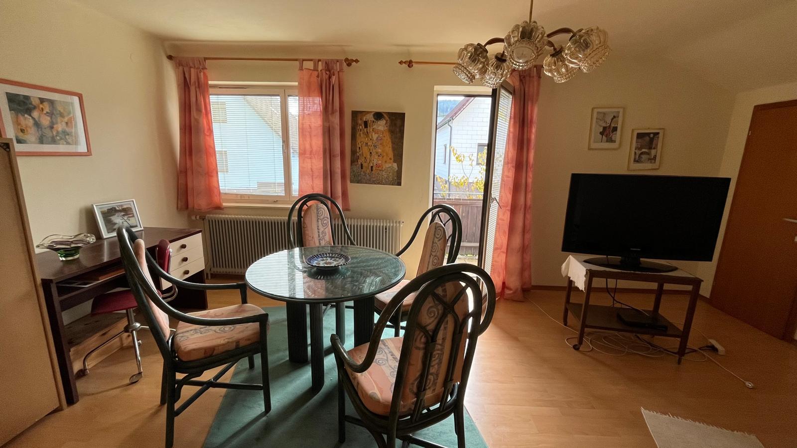 Wohnzimmer mit Zugang zum Balkon und Abstellraum