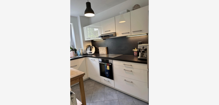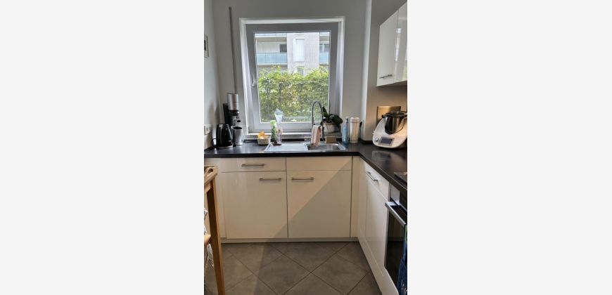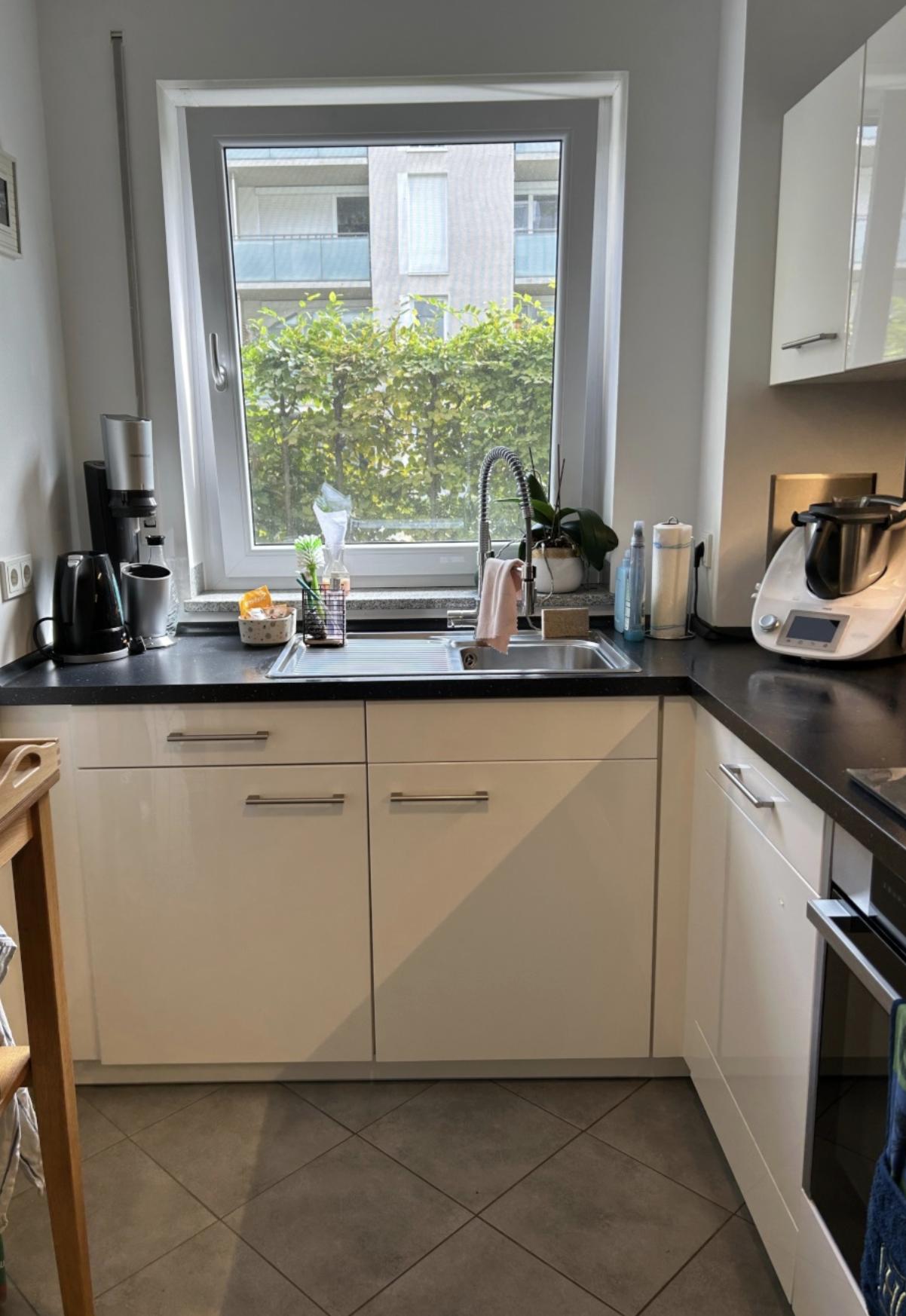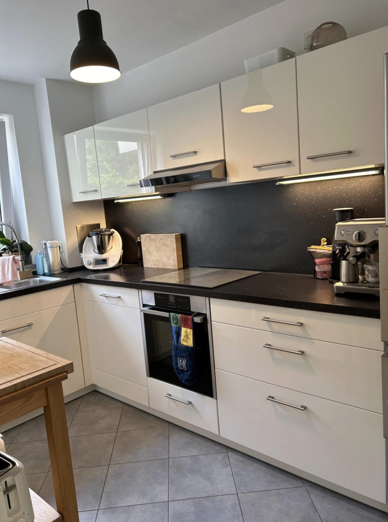 Die separate Einbauküche mit Abstellkammer ist mit hochwertigen Küchengeräten ausgestattet, darunter ein Induktionskochfeld, ein Thermomix, eine Siebträgermaschine und eine Heißluftfritteuse.