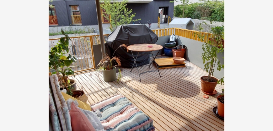 Sie besteht aus zwei Stockwerken, ein großer Wohn-/Essbereich im Erdgeschoss mit Zugang zur Terasse und Garten sowie Gäste-WC und zwei kleinen Abstellräumen, und drei Zimmer inkl. Bad mit Badewanne und Waschmaschine im ersten OG, über eine Treppe verbunden. Im Obergeschoss gibt es ein Schlafzimmer mit großem Bett und Kleiderschrank, ein Arbeits- und Gästezimmer, in dem auch ein Bett steht (140 cm) sowie ein Sport-/Wäschezimmer und das Bad.
