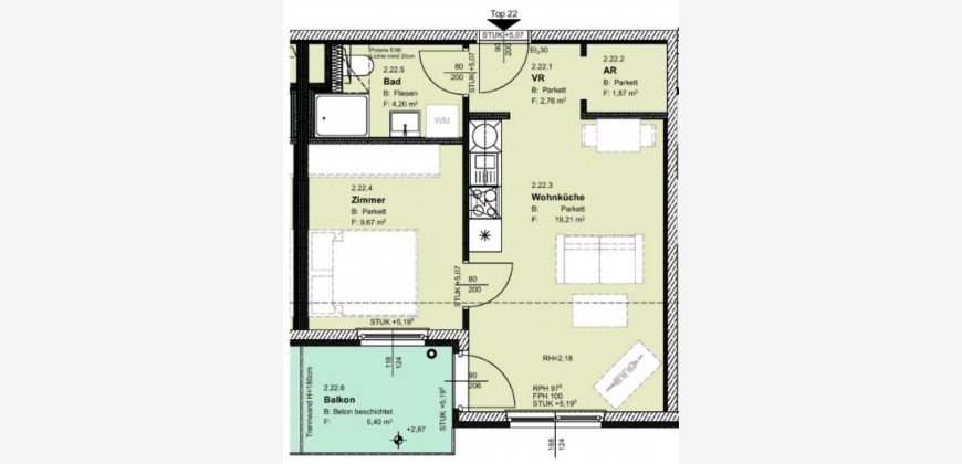 Der Balkon mit einer Fläche von 5,4 m² lädt zum Entspannen ein und bietet einen ruhigen Blick ins Grüne. Die Wohnung befindet sich im 1. Stock und ist bequem über einen Aufzug erreichbar.