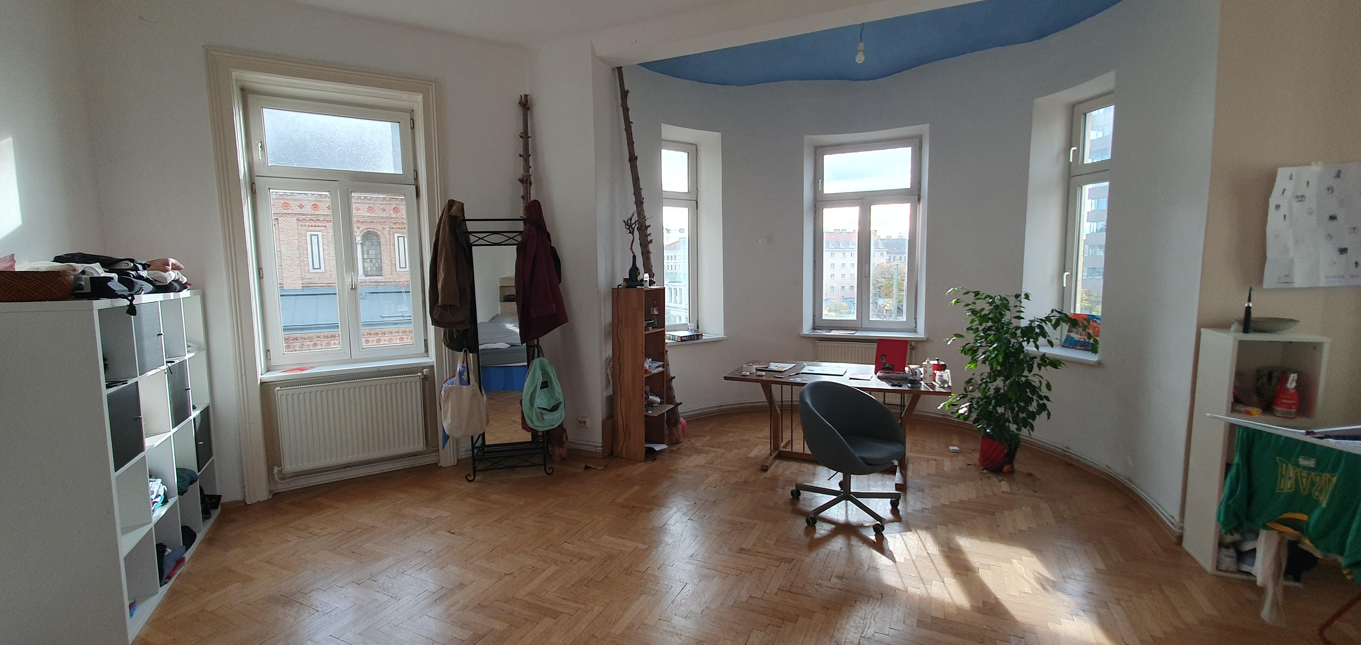Das größere Zimmer hat ca. 35m^2 und bietet nicht nur sehr viel Platz, sondern durch seine großen Fenster zu zwei Seiten auch sehr viel Licht und einen wunderschönen Blick über Wien und die anliegende Kirche.