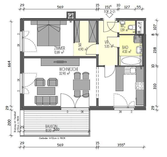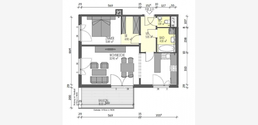 Wohnküche, Schlafzimmer, Bad, WC zentral begehbar