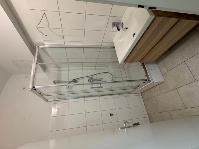 kleines Badezimmer mit Dusche, Waschbecken und Waschmaschinenanschluss