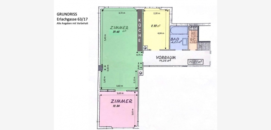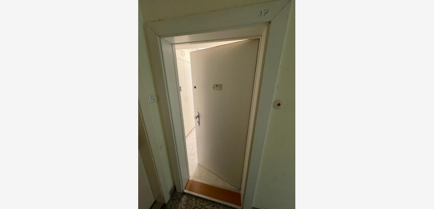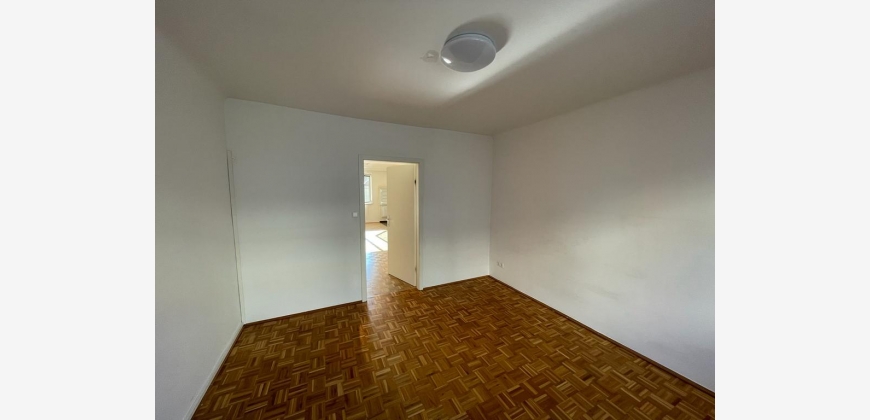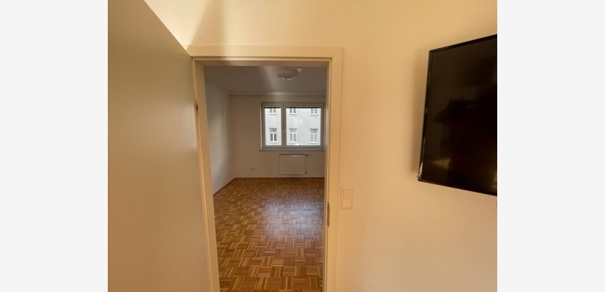 Die Aufteilung der Wohnung ist wie folgt: man erreicht die Wohnung über ein Vorzimmer, welches in länglicher Form über einen sehr großen und praktischen Einbauschrank verfügt. Vom Vorzimmer aus gelangt man in das separate WC und das Badezimmer, welches über eine Duschbadewanne verfügt. Außerdem erreicht man vom Vorzimmer in zwei der drei Zimmer direkt.