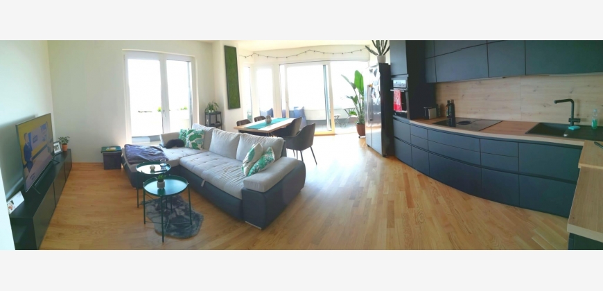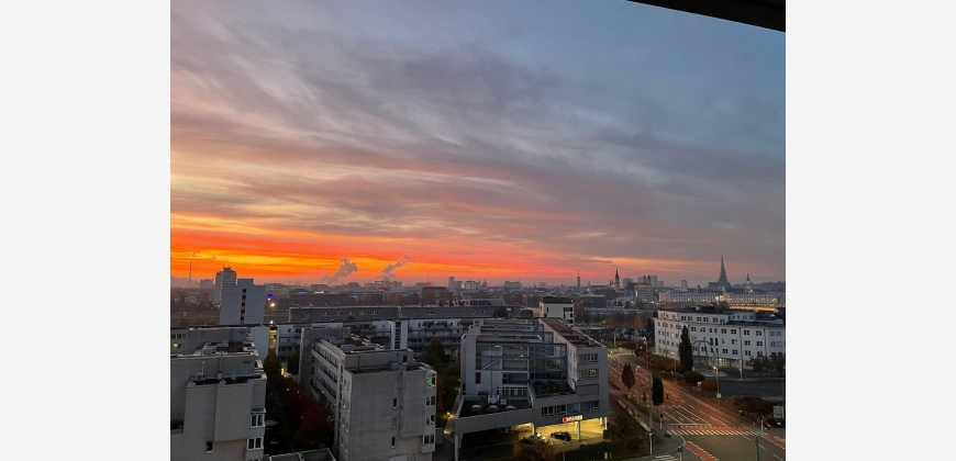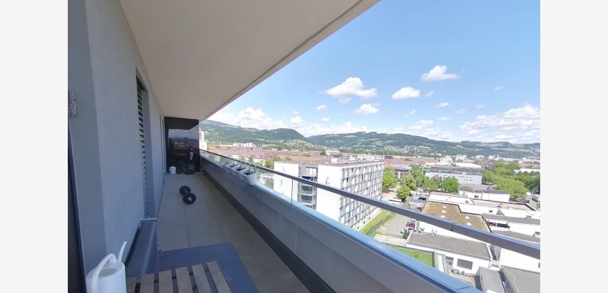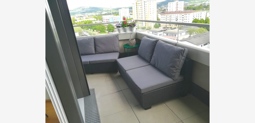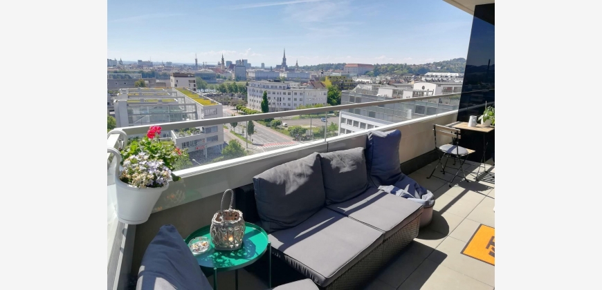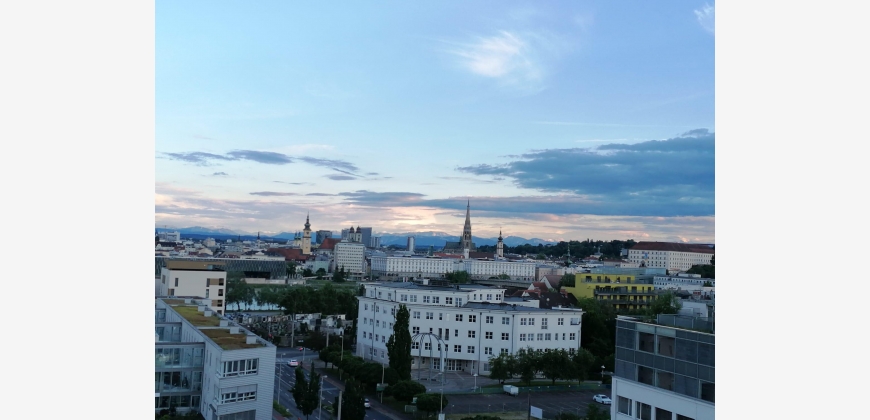 Die Eckwohnung befindet sich im 9. Stock, hat einen riesigen Balkon (26,5 m2) und zeichnet sich durch ihren beeindruckenden Ausblick aus. (Donau, Stadt Linz und sogar die Alpen)