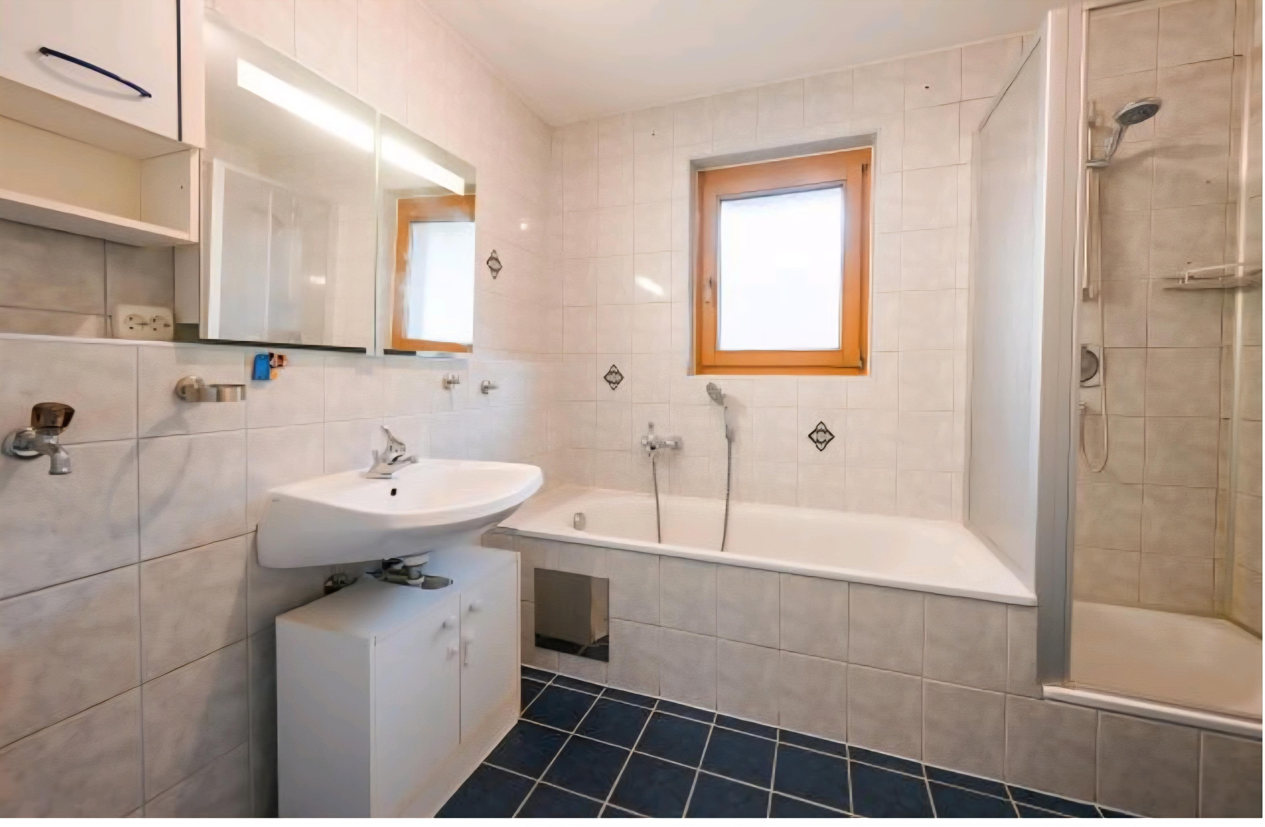 Bad mit Badewanne, Dusche und Fenster, WC separat. Waschmaschinenanschluss vorhanden.