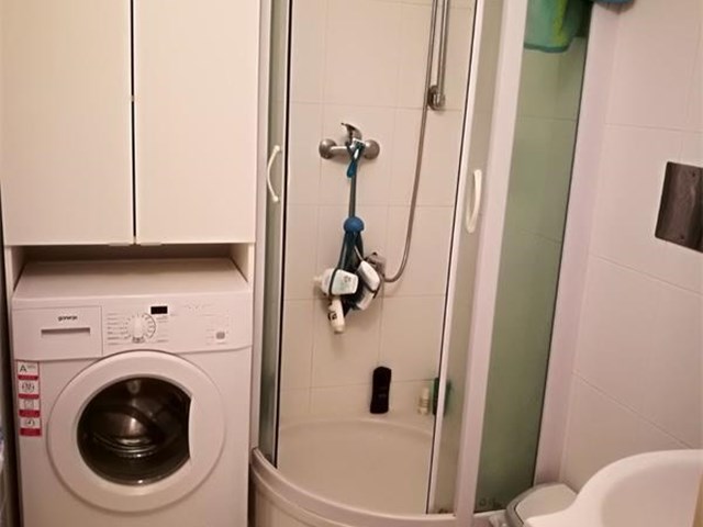 Badezimmer mit Dusche, Waschmaschine und Waschbecken.