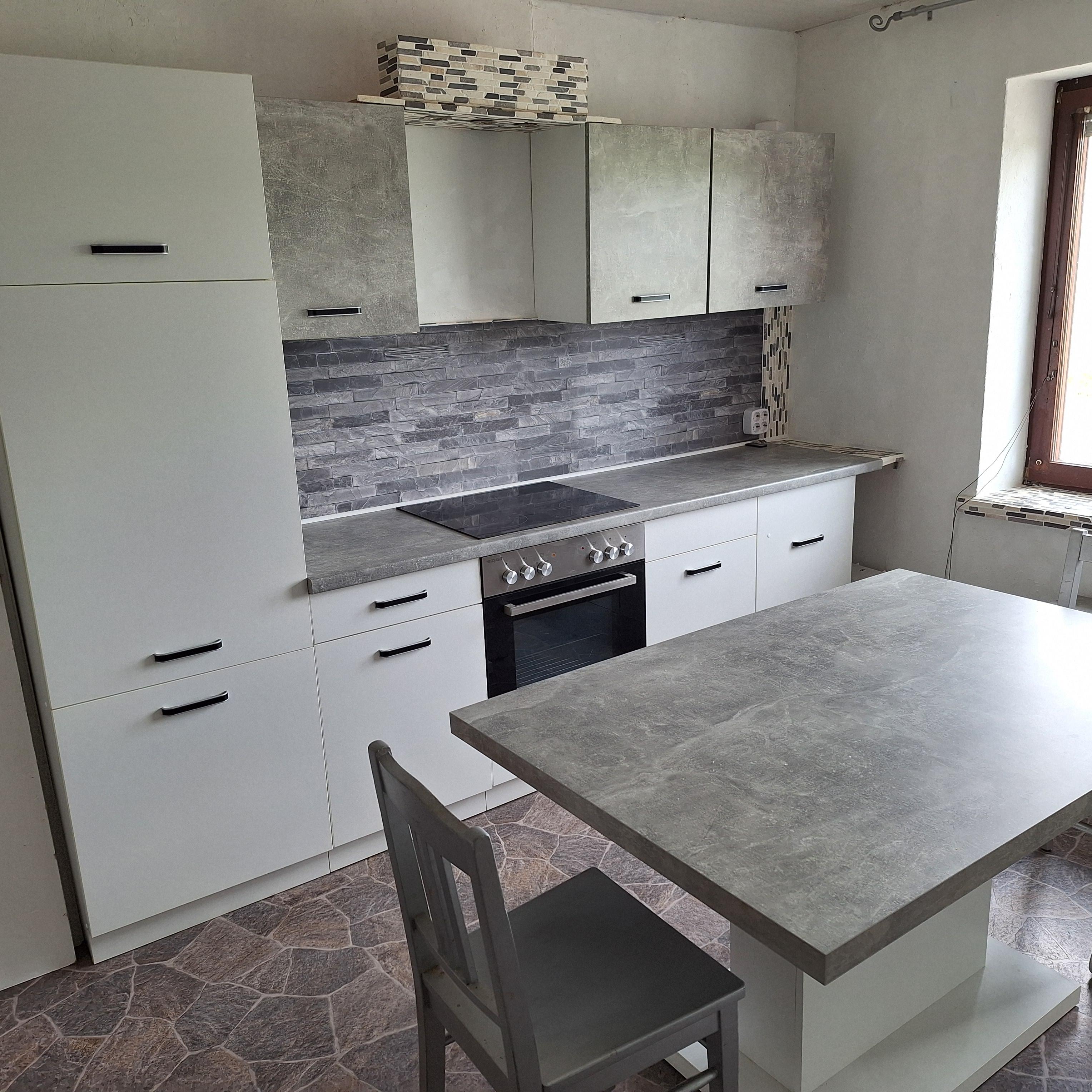 Die Küche ist modern in Weiß und Betonoptik gehalten und nur wenig genutzt.