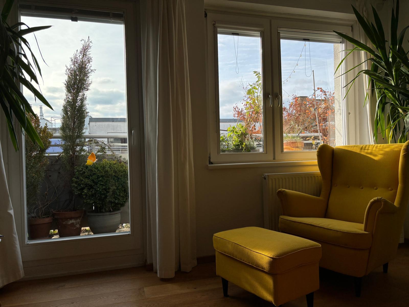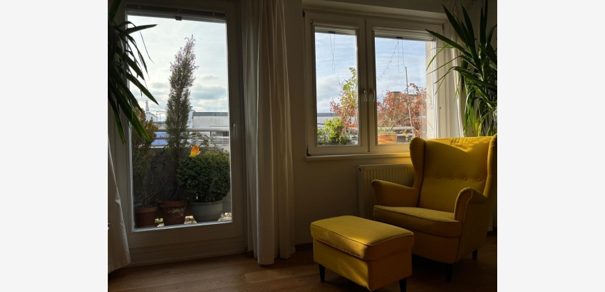 Aufgrund der Lage im obersten Geschoß (7. Stock, mit Aufzug) und ihrer kompletten Südwest-Ausrichtung ist die Wohnung sehr hell und erlaubt es die Nachmittags- bzw. Abendsonne sehr lange zu genießen.