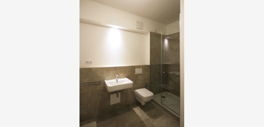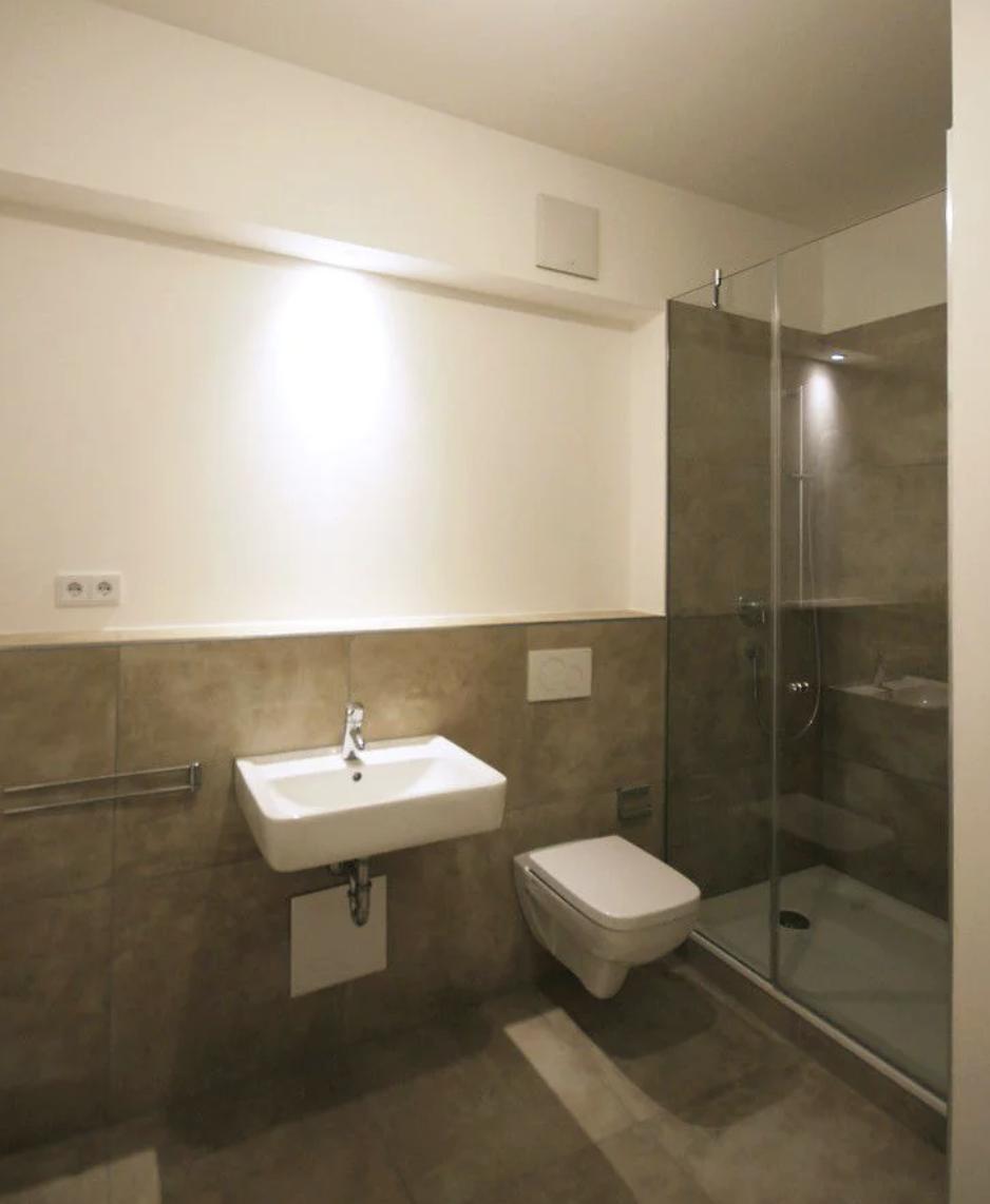 Das großzügige Duschbad ist mit eleganten, pflegeleichten Design-Fliesen ausgestattet und verfügt über moderne Sanitäreinrichtungen, darunter eine Dusche mit Glasabtrennung, ein Waschbecken und ein WC.