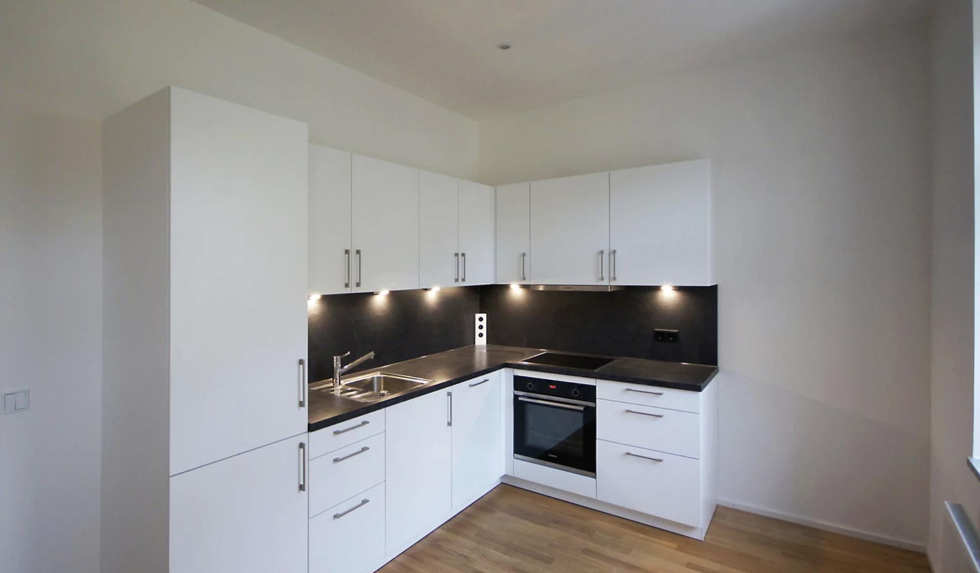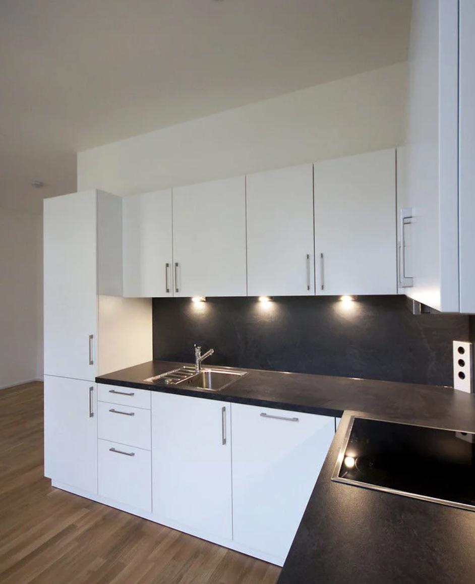 Mit einer typischen Altbau-Deckenhöhe von etwa 2,80 m bietet die Wohnung einen offenen Wohnbereich mit integrierter Küche. Die stilvolle, schwarz-weiße Einbauküche ist mit hochwertigen Siemens-Elektrogeräten ausgestattet und lässt keine Wünsche offen.