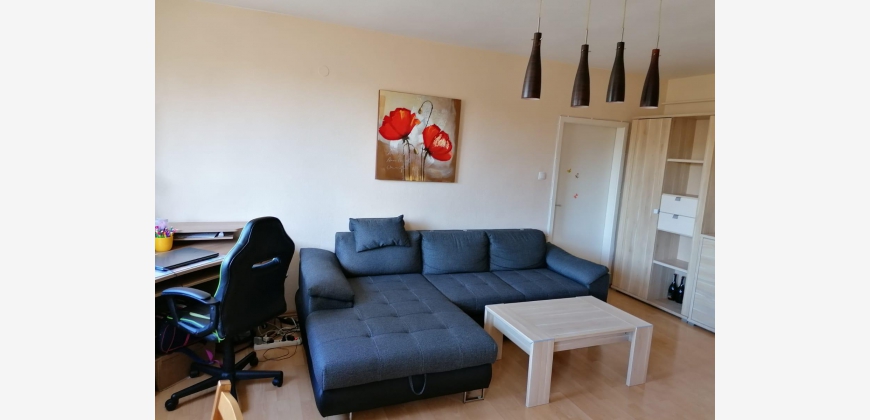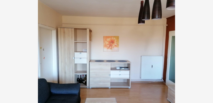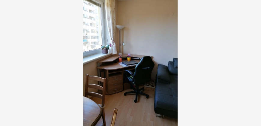 Geräumiges Wohnzimmer mit Schreibtisch zwei Schränken, Couch zum ausziehen, Fernseher. Offene Küche ums Eck.