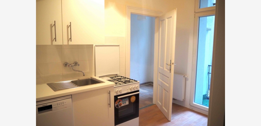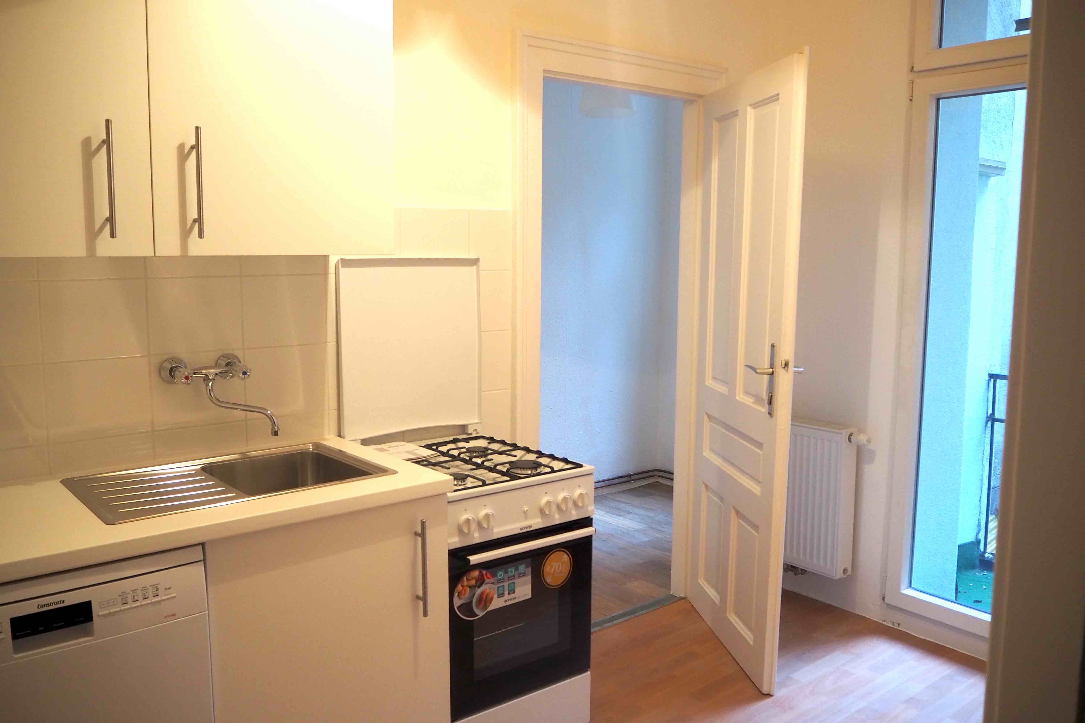 Die Küche ist mit einer neuen Küchenzeile, inklusive Geschirrspüler, Herd und Kühlschrank ausgestattet. Direkt neben der Küche gibt es einen kleinen Balkon (ca. 2,5 m²). Eine überdachte Fahrradabstellmöglichkeit im Innenhof ist ebenfalls vorhanden.
