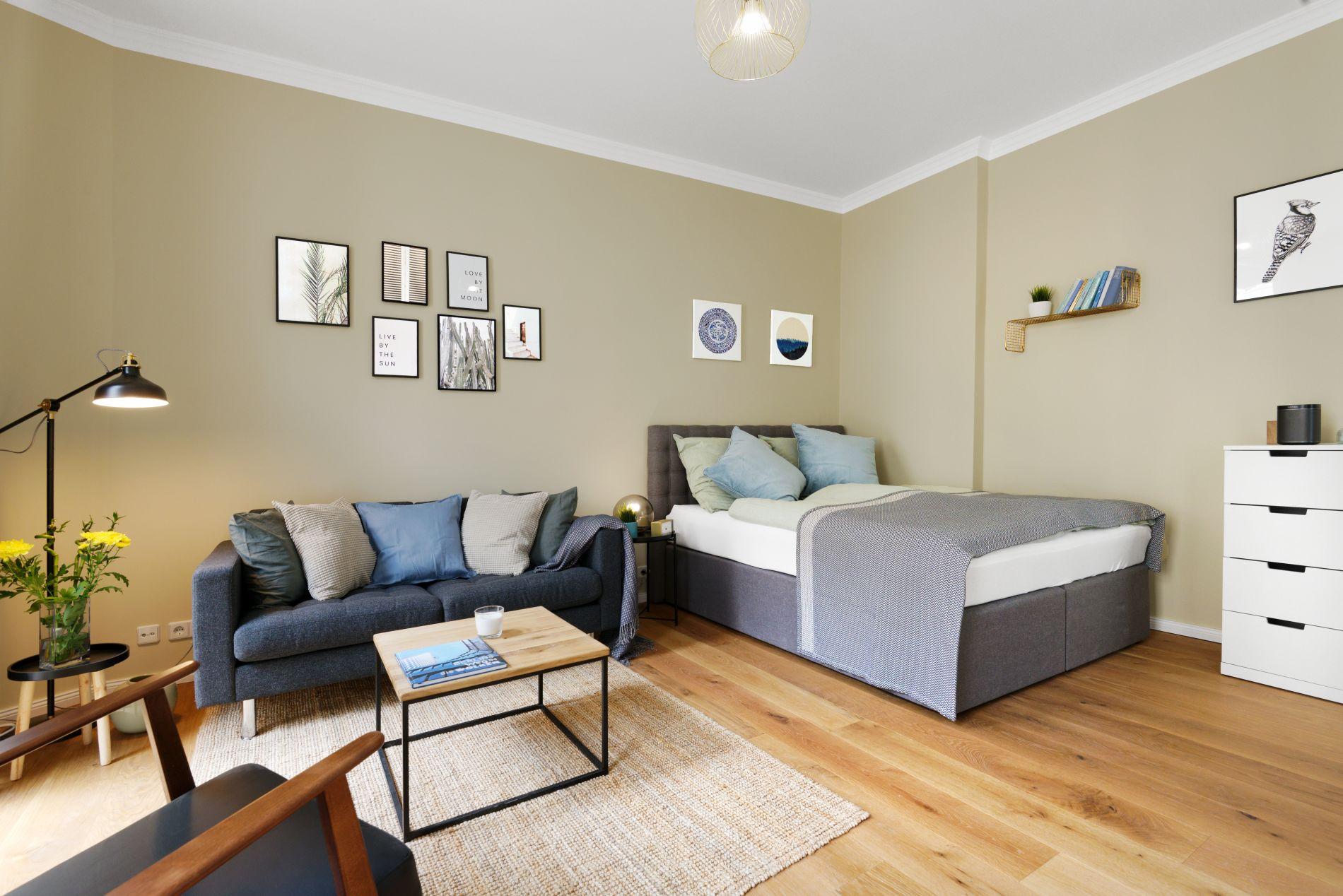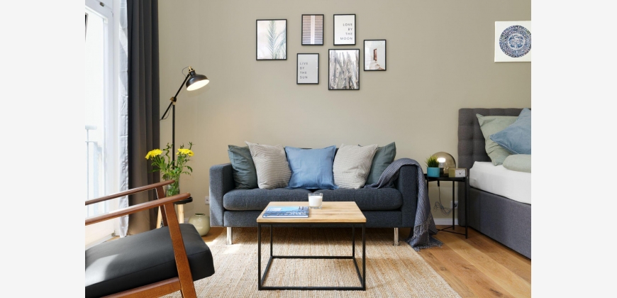 Das wundervoll helle und effizient möblierte 1-Zimmer Apartment (Größe: 40 qm) mit komfortablen Kingsize Boxspring Bett . Das Badezimmer ist mit einer großen begehbaren Dusche ausgestattet . Die gesamte Wohnung wurde in einem modernen, sowie gemütlichen Stil eingerichtet . Die offene und voll ausgestattete Wohnküche rundet dieses Premium-Apartment ab. Neues Mobiliar.