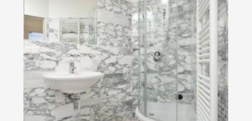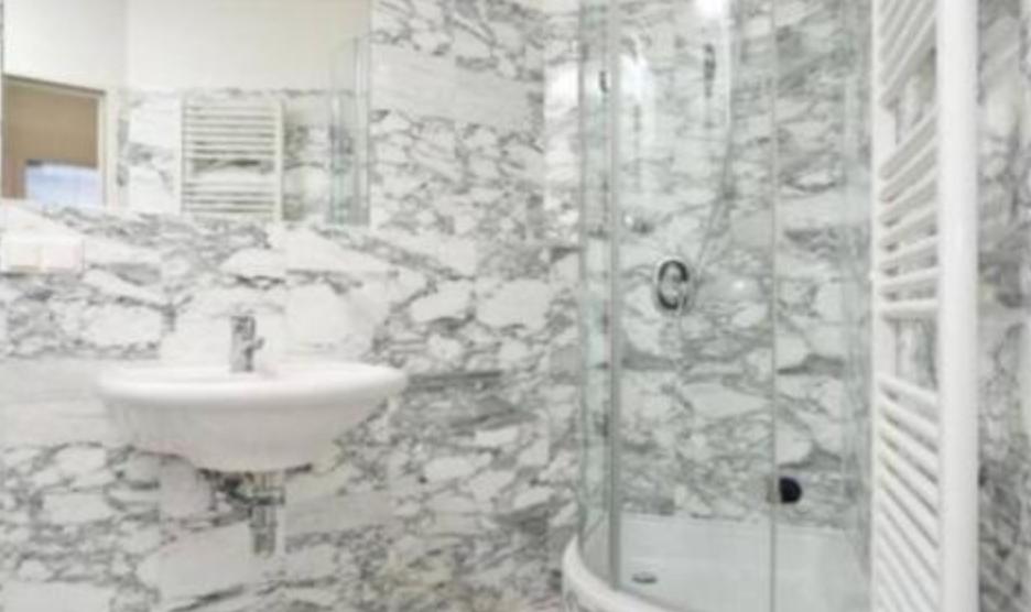 bad komplett aus weiß/grauem marmor mit neuer dusche, wc, waschmaschinenanschluss, riesen spiegel (waschmaschine ist keine drin, es gibt aber auch eine waschküche im haus)