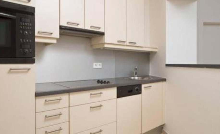 küche ist neu mit neuen geräten (war drin) inkl. herd, backrohr, kleiner geschirrspüler, mikrowelle, offene küche zum wohn-schlafraum (mit durchreiche, sieht schick aus)