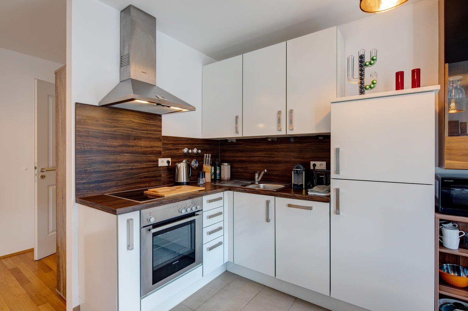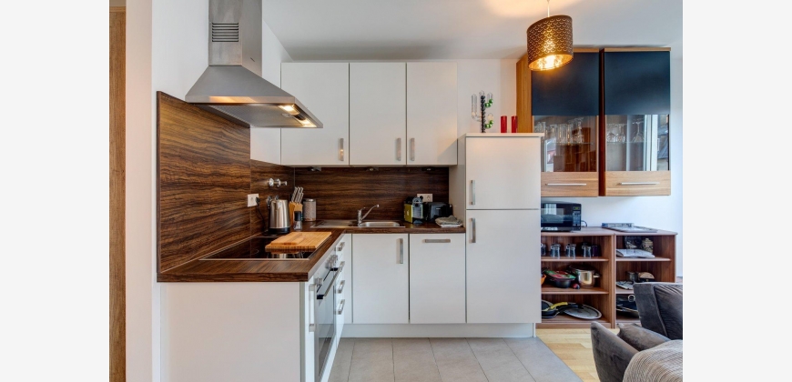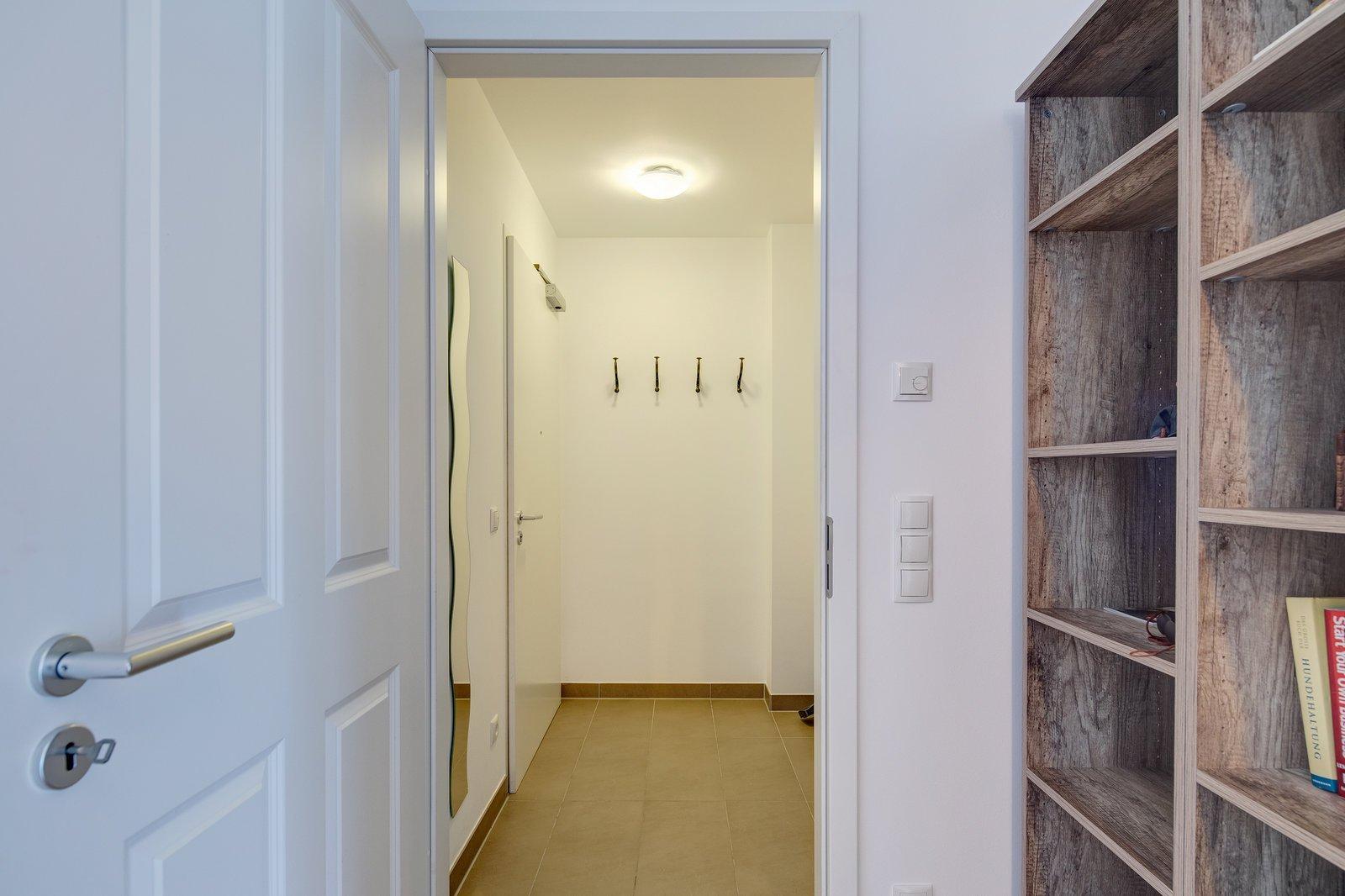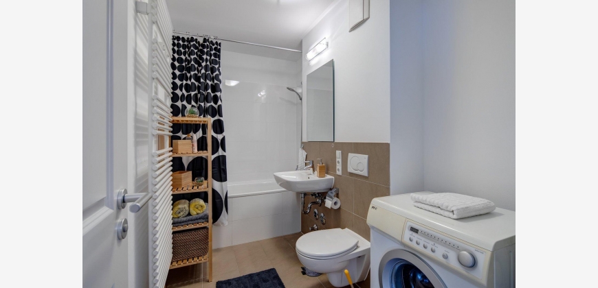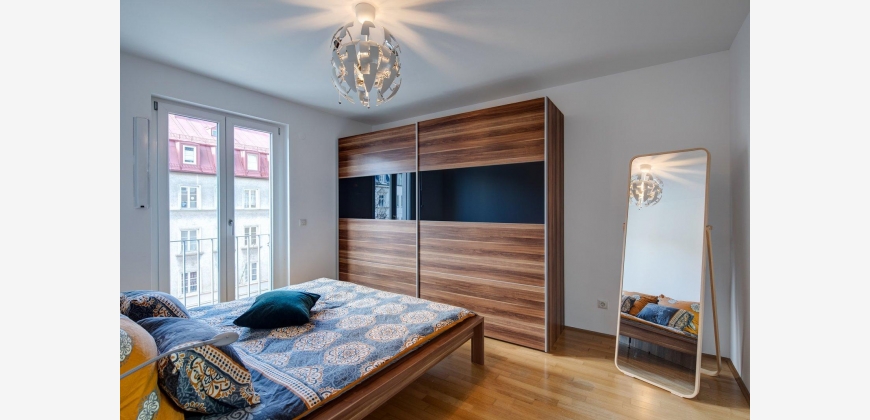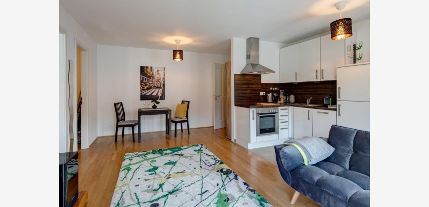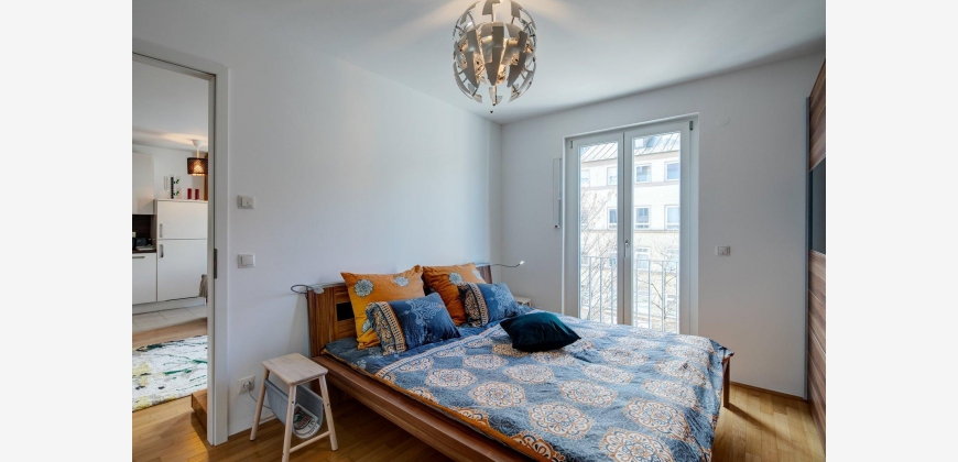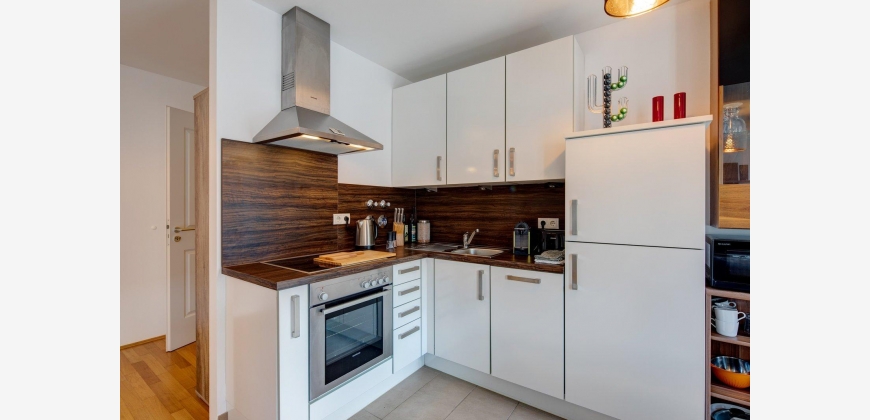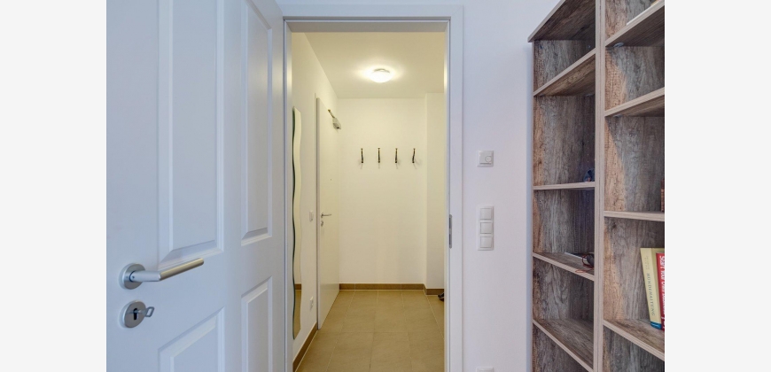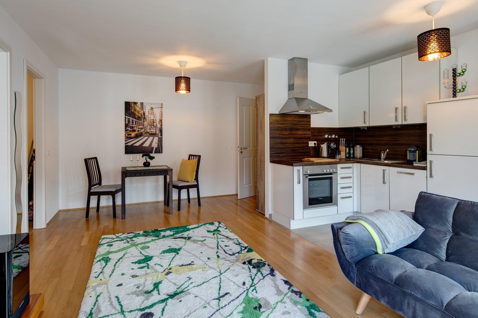 Das Appartemtent ist sehr hell und ruhig im 2. Stock gelegen, vom Eingangsbereich gelangt man ins Wohnzimmer und zum Balkon, weiter in den abgetrennten Schlafbereich und von dort aus ins Badezimmer, die Küche ist vom Wohnraum getrennt.
