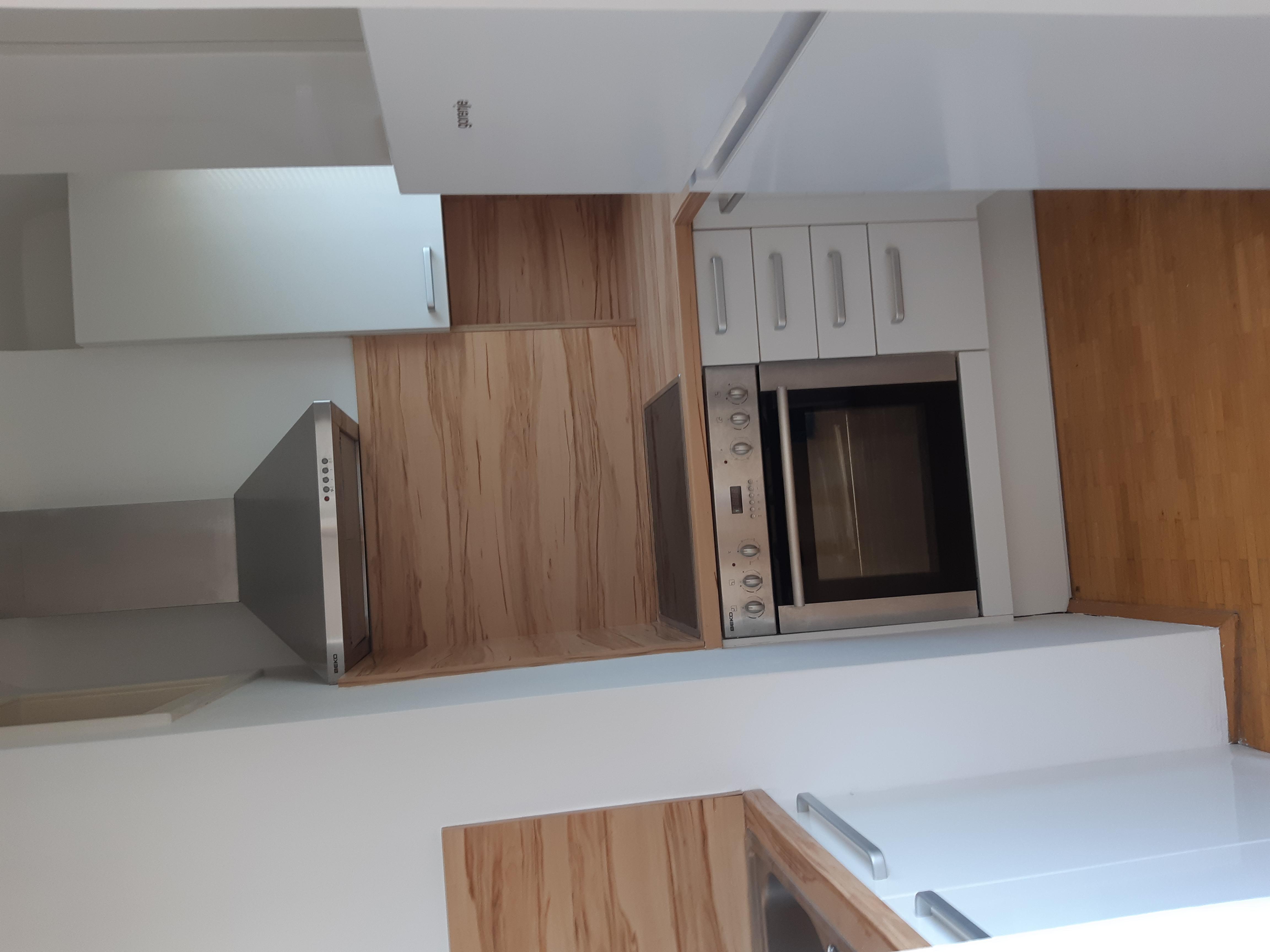 Einbauküche mit Elektroherd und Kühlschrank. Terrasse mit Blick Richtjng Kahlenberg.