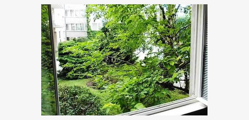 Mietwohnung im Halbstock, alle Fenster münden in einen grünen, versperrten Innenhof;