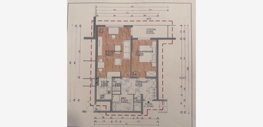 Diese wunderschöne, helle und perfekt aufgeteilte 2-Zimmer - Wohnung liegt im 4. Liftstock und beinhaltet ca. 55,4m2 Wohnfläche zuzüglich ca. 6m2 West-Loggia.