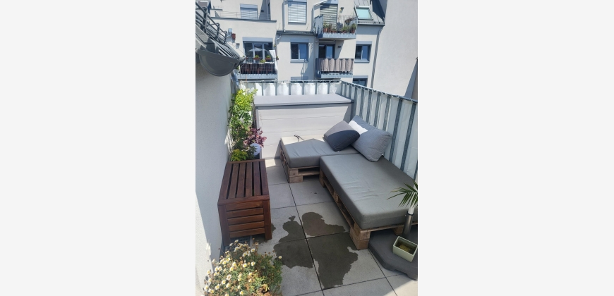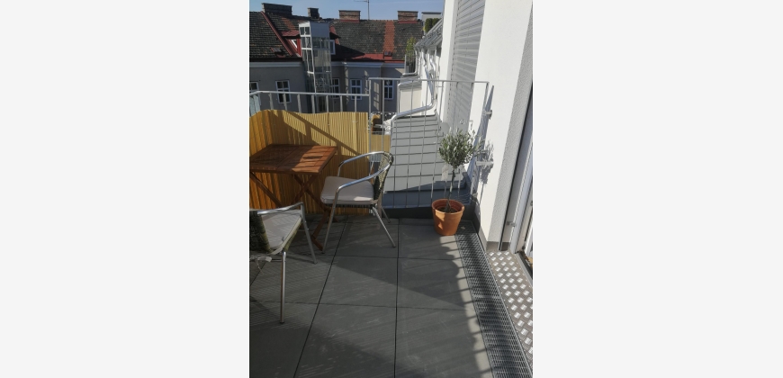- Die Wohnung ist im Dachgeschoss mit großem Balkon und modern möbliert