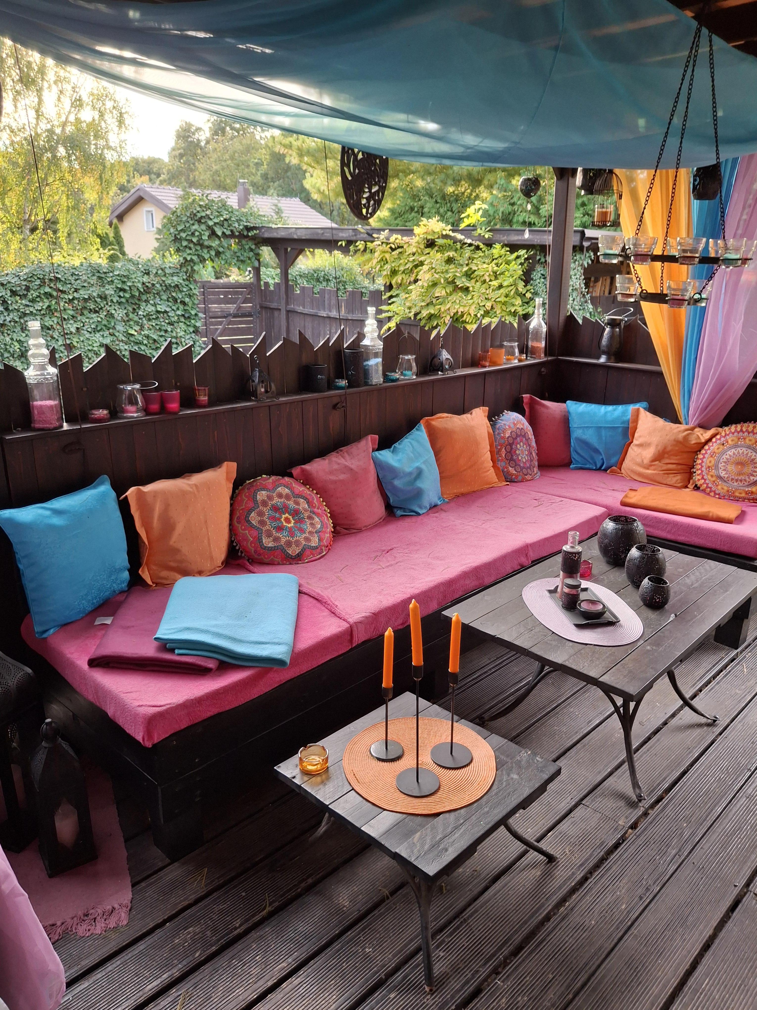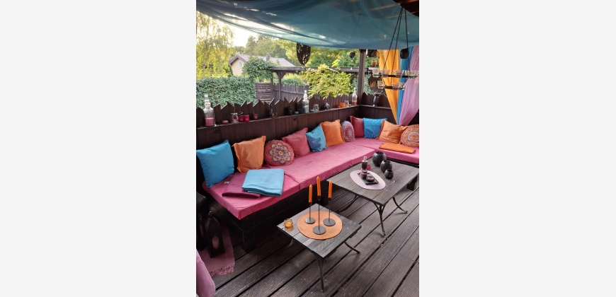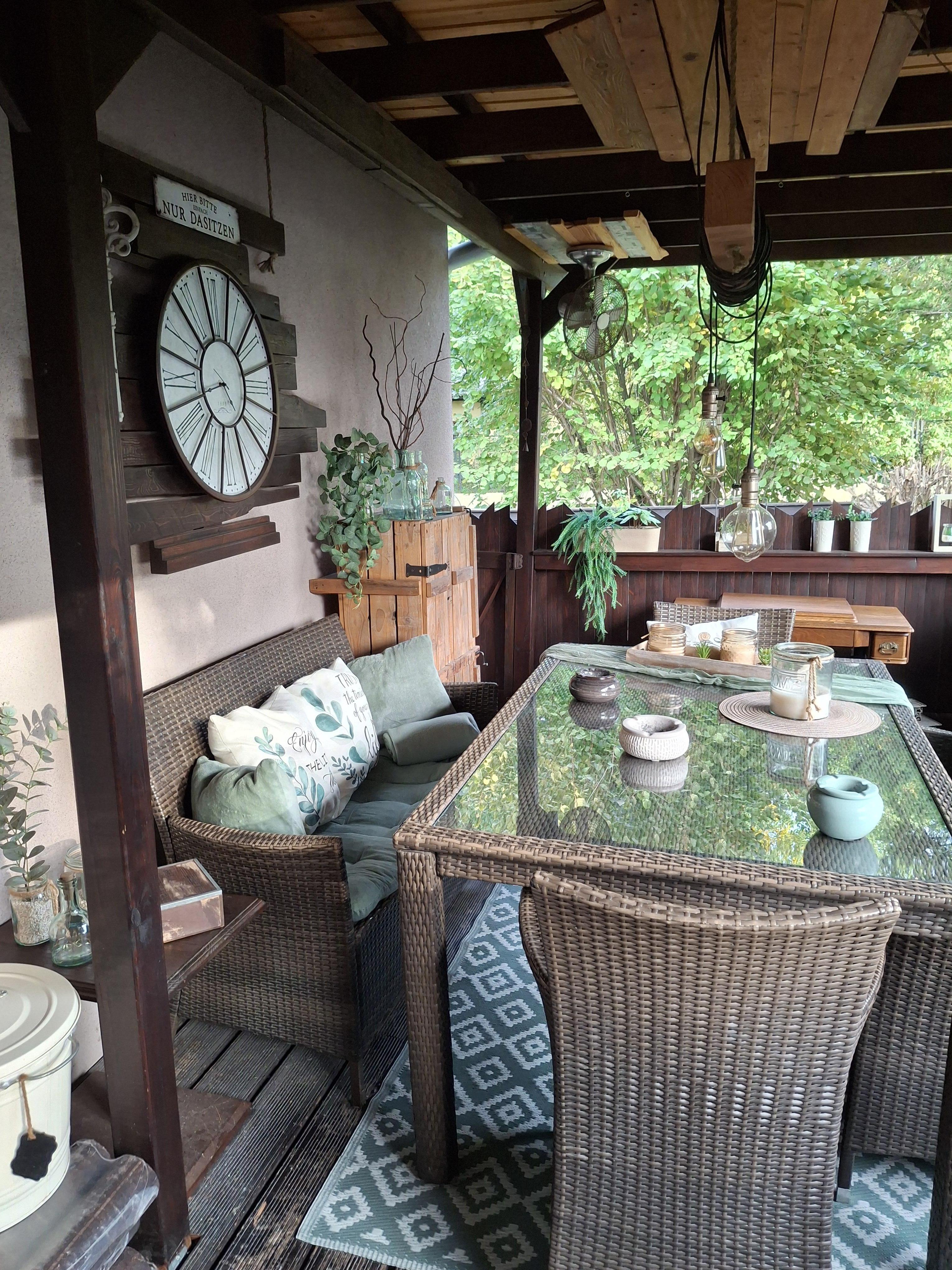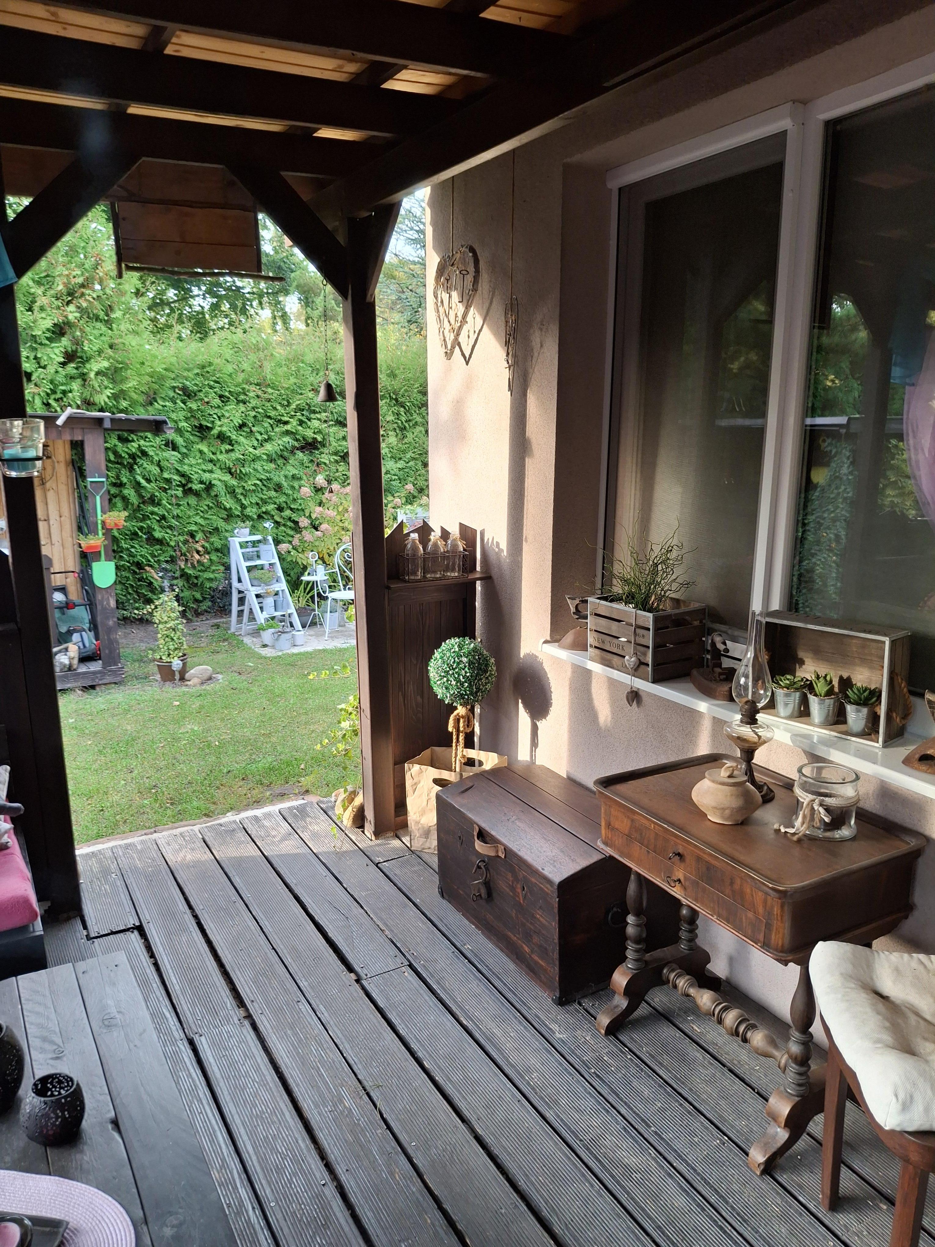 Die Terrasse vor dem Haus misst rund 34m2, ist komplett überdacht und mit Rollos versehen.