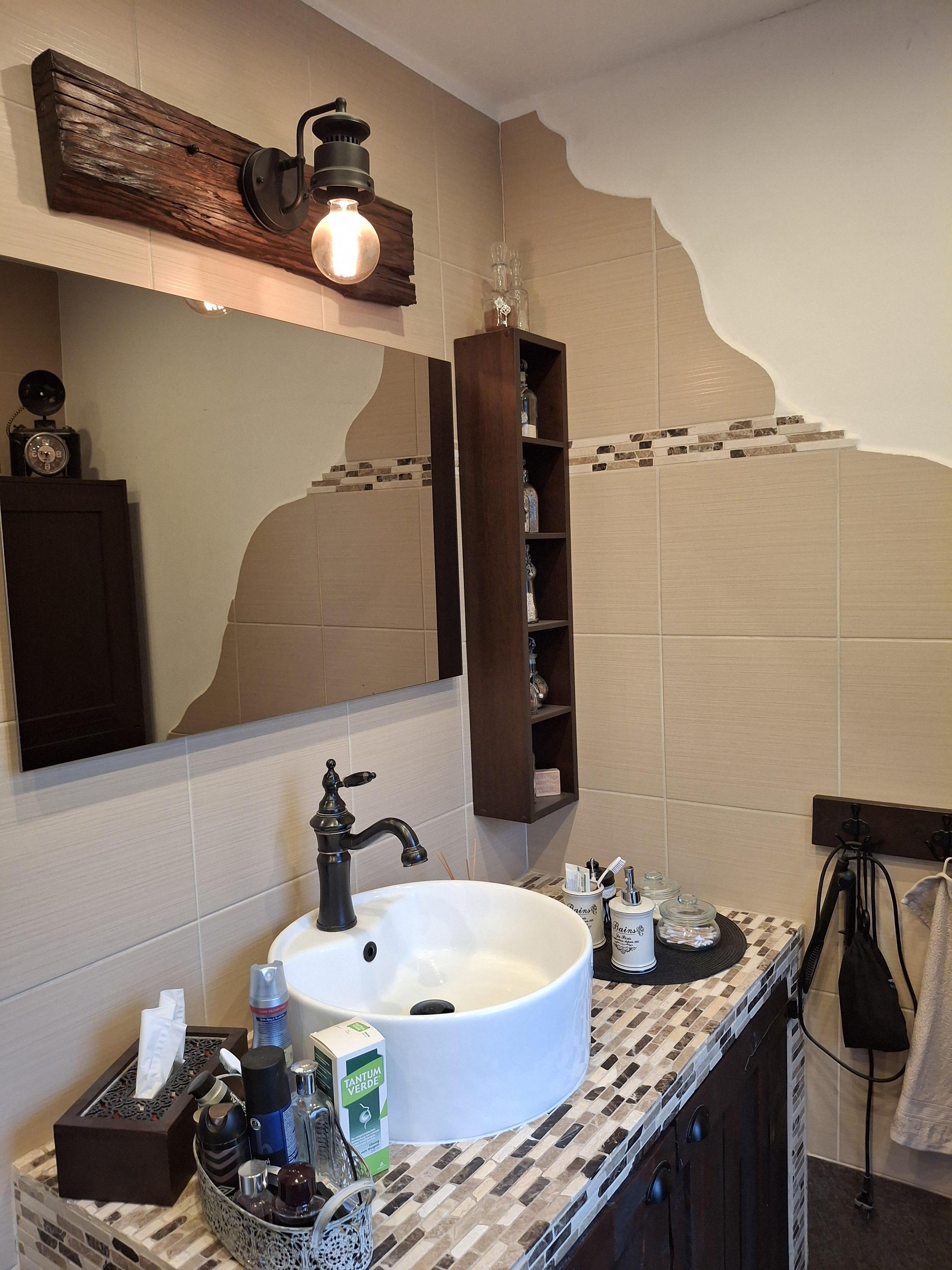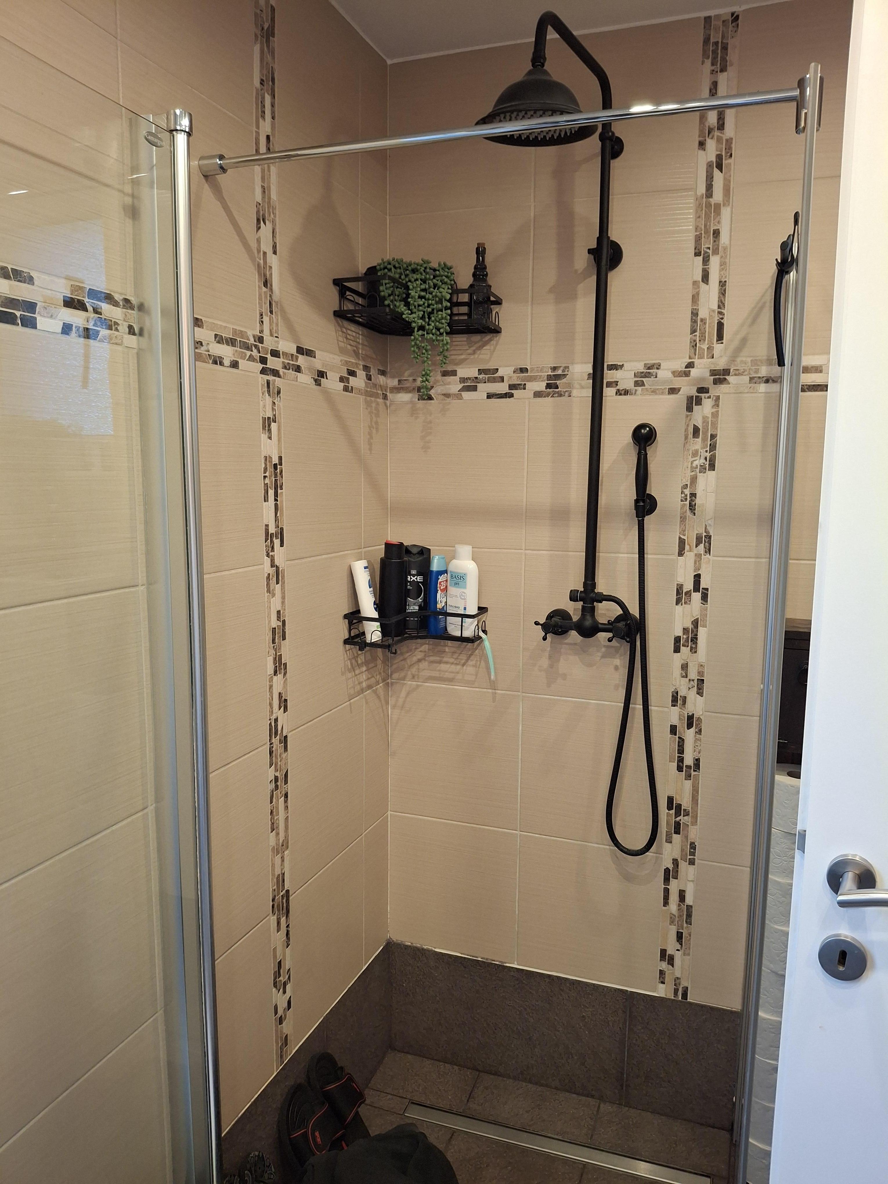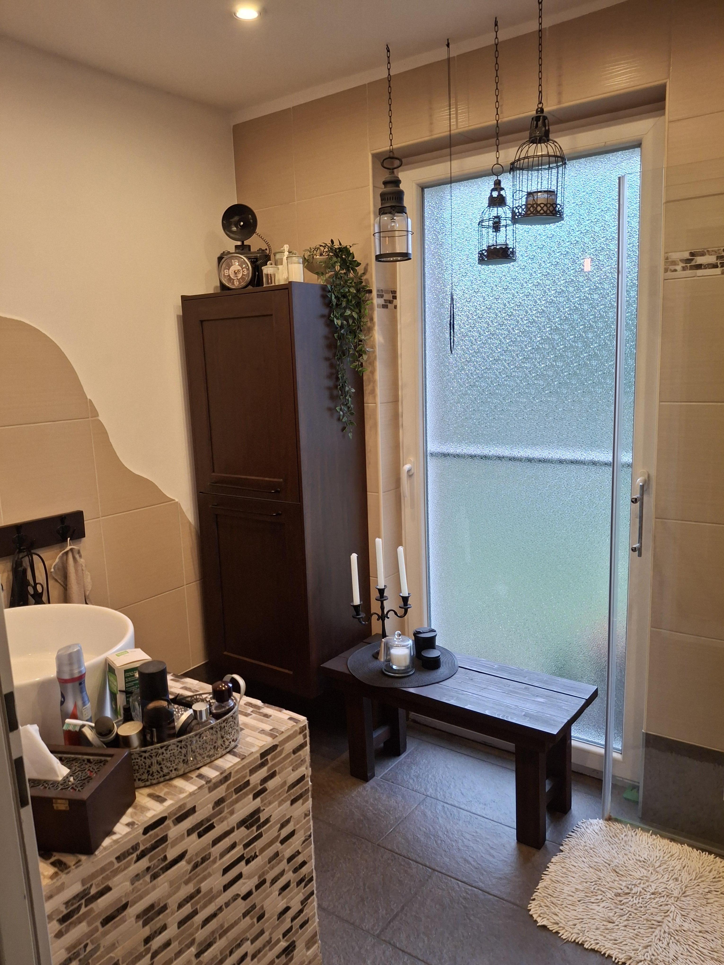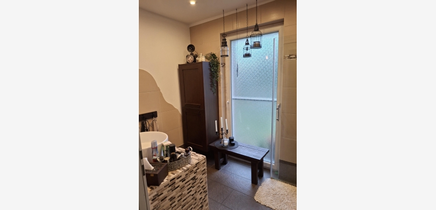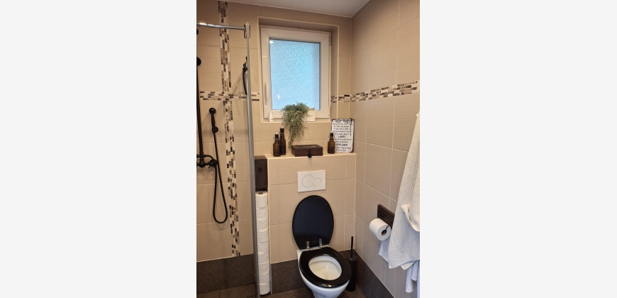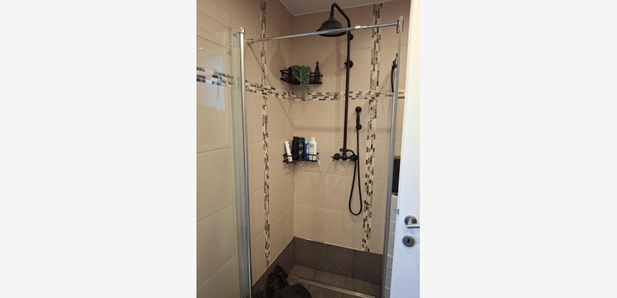 Neben der Küche befindet sich das geräumige Badezimmer mit Dusche und WC.