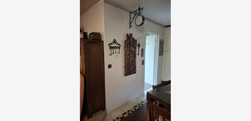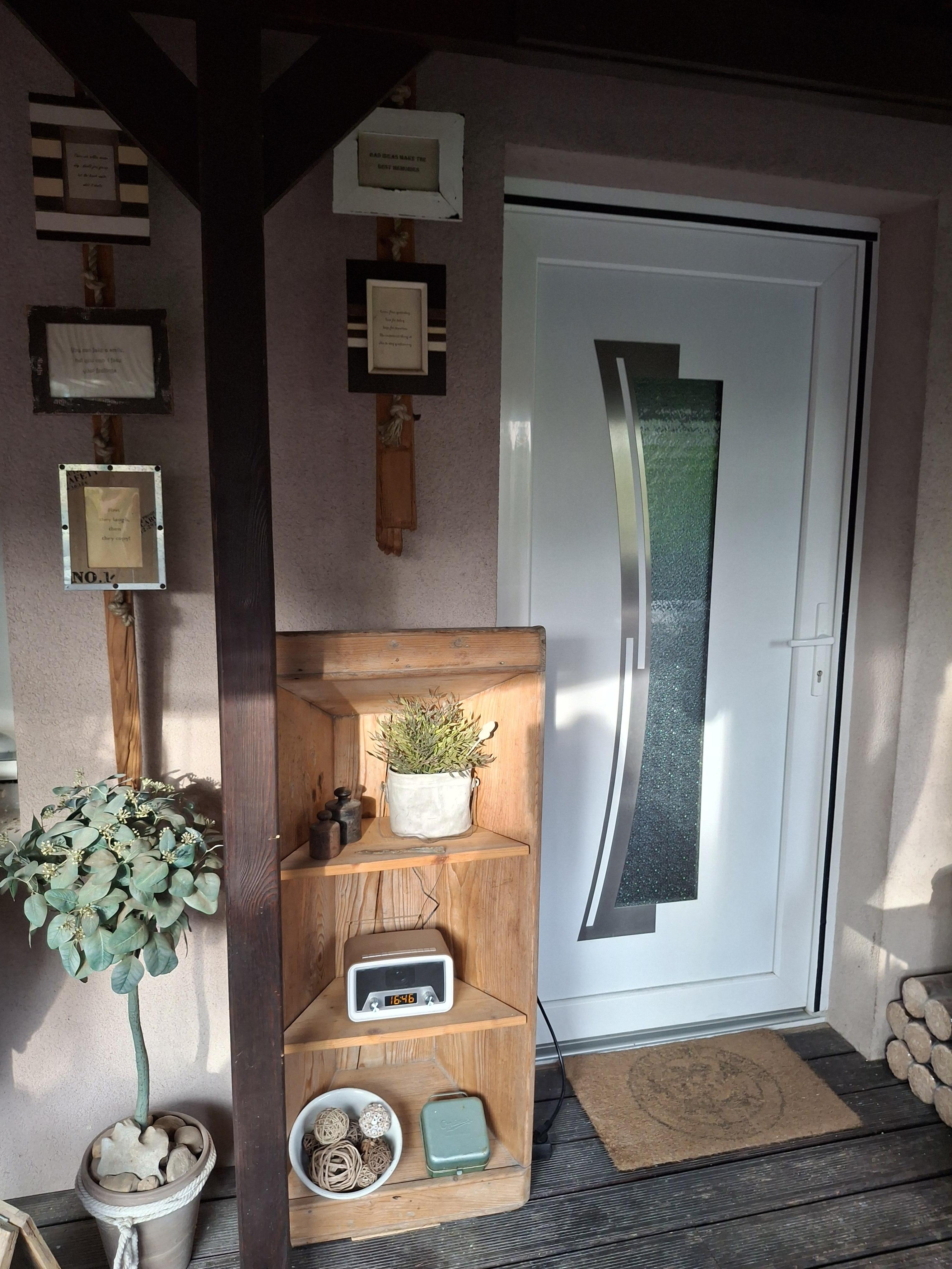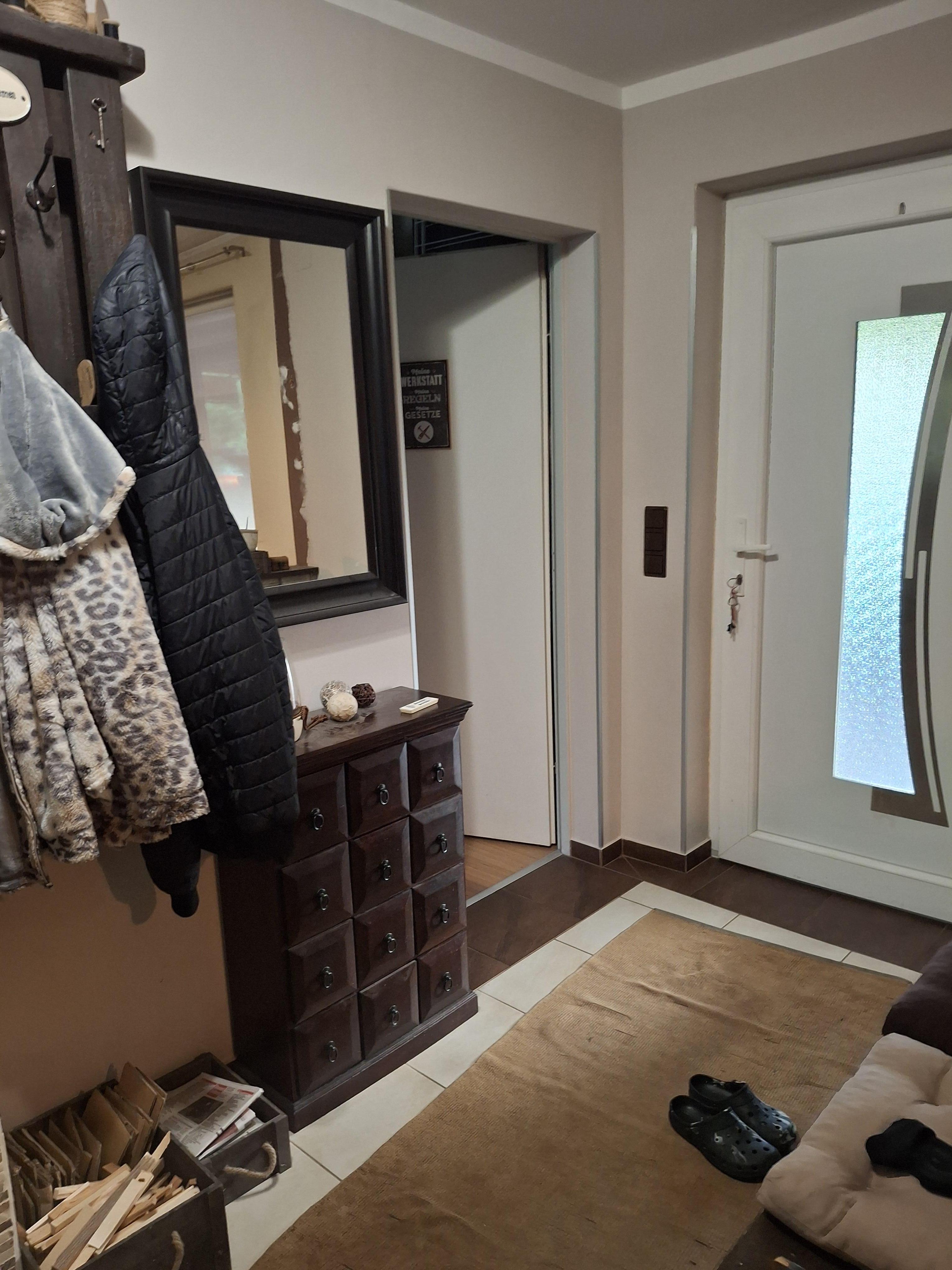 Vom Eingang aus betritt man das Vorzimmer, das durch eine halbhohe Mauer vom Wohnzimmer, welches man über eine Stufe erreicht, getrennt ist.