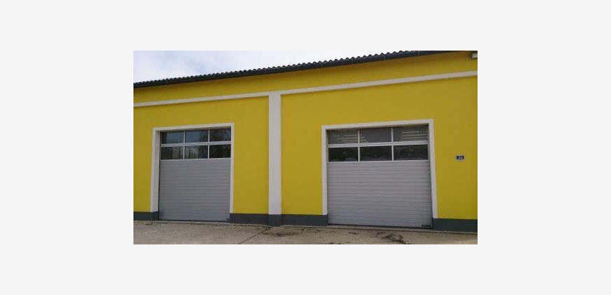 2 Hallenräume in einem Gebäude mit jeweils einem Sektionaltor (Hörmann 3,5x4m), Büro, WC+D, 2 kleine Lagerräume, Dachgeschoss mit Fenster und 2 Eingängen, 100m2 Carport direkt seitlich an Wkstt. mit 8 Stellplätzen.