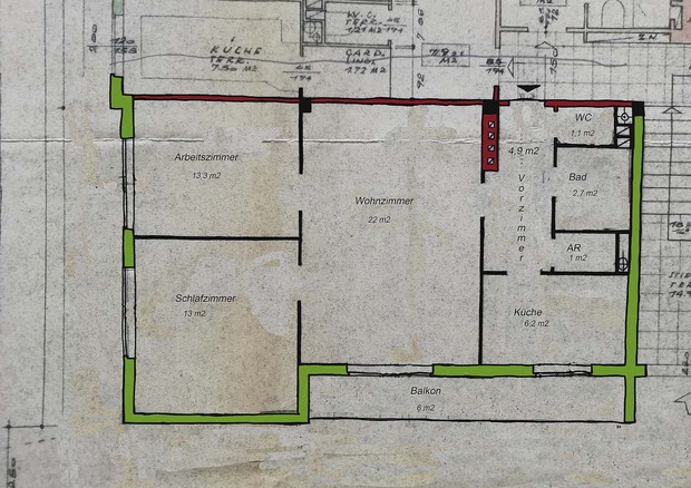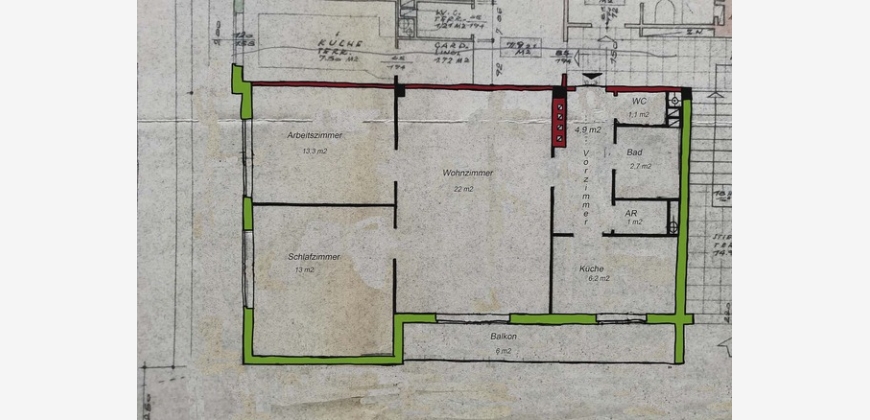Die Wohnung befindet sich in einem neuen Zustand ; modern möbliert . Böden (VZ,Bad Küche,WC-Fliesen alle übrigen Räume Parkettboden) . Heizung (Fernwärme) Kellerabteil 3 m² Fahrradabstellraum