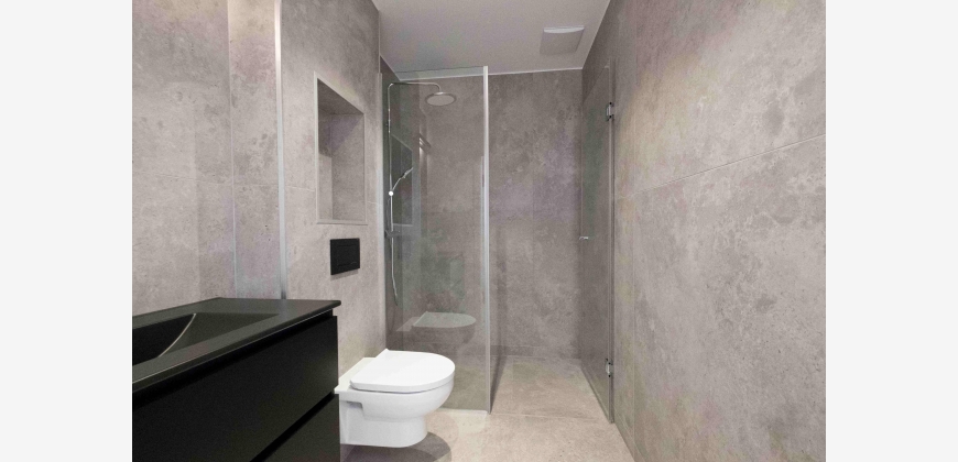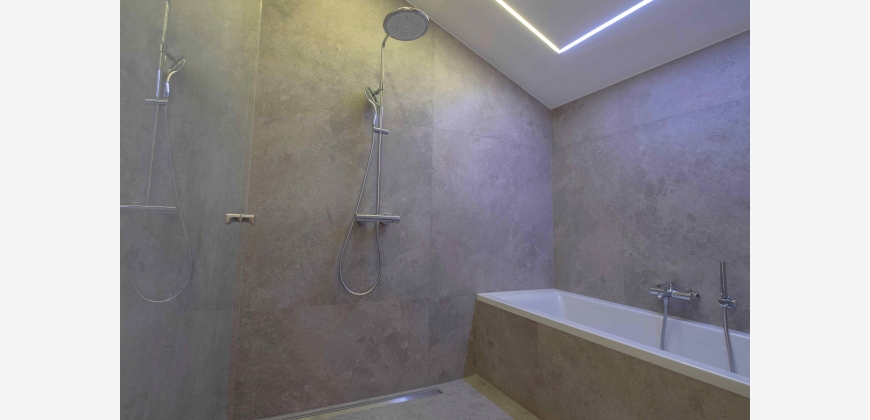 Um die Hochwertigkeit der Immobilie zu unterstreichen sind Landhausdielen in Übergröße verlegt worden und besonders schöne, große Fliesen in Betonoptik verarbeitet worden.