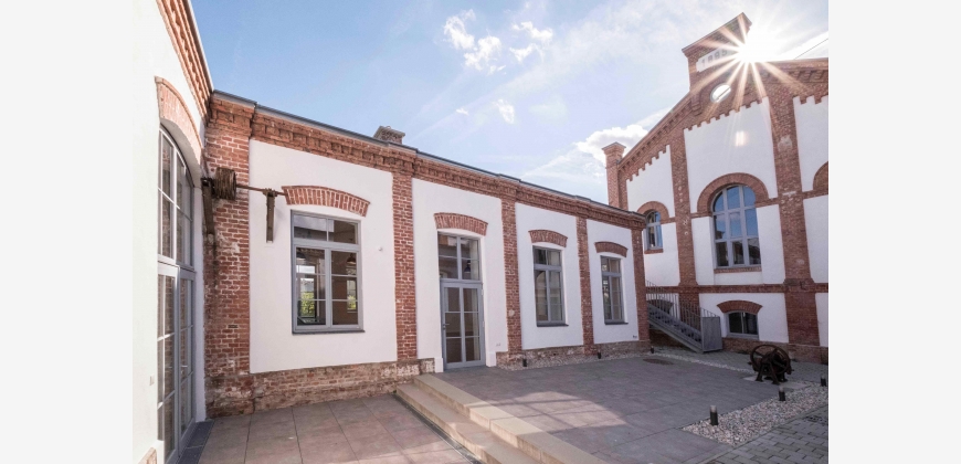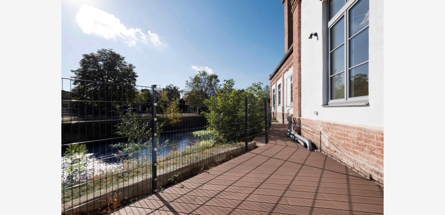 Die zweite, großzügige Terrasse liegt direkt am Denkmal Geschützen Schlot der alten Fabrik und bietet am Abend ein harmonisches Lichtspiel und Ruhe zum entspannen!