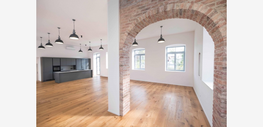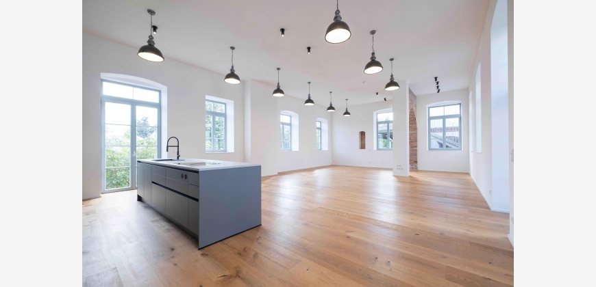 Einmal ums Eck, gelangt man in den offenen Wohnbereich des Lofts, welches durch 8 Fabriksfenster und 2 Terassentüren, auf 3 Seiten, lichtdurchflutet wird!
