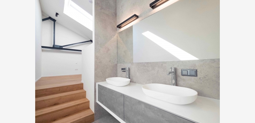Von dem zentralen Vorraum aus, gelangt man über eine Treppe in das Obergeschoss des Lofts.