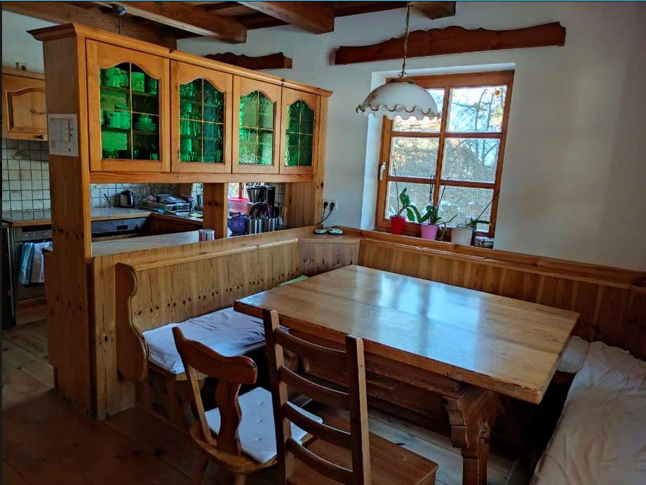 Gemütliches Wohnzimmer im Vollholzstil mit riesigem Sofa (auch als Gästebett nutzbar), Esstisch für 8 Personen, Beamer und wärmendem Holzofen