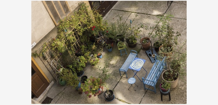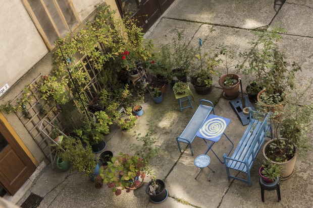 Im Hof gibt es viele Pflanzen und eine gemütliche Sitzecke, die von allen Bewohnern genutzt werden kann.