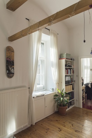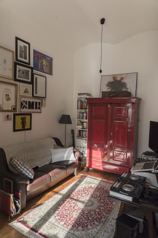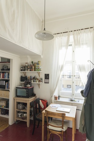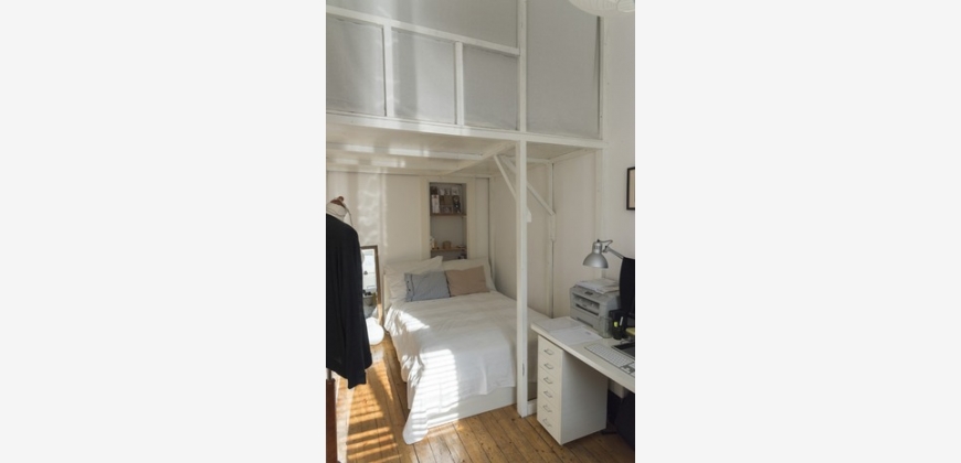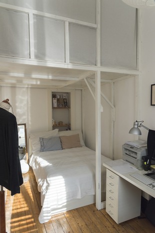 Wohn/Schlafraum: Über dem Bett befindet sich eine Hochebene zum Schlafen, die bisher auch als Stauraum genutzt wurde.