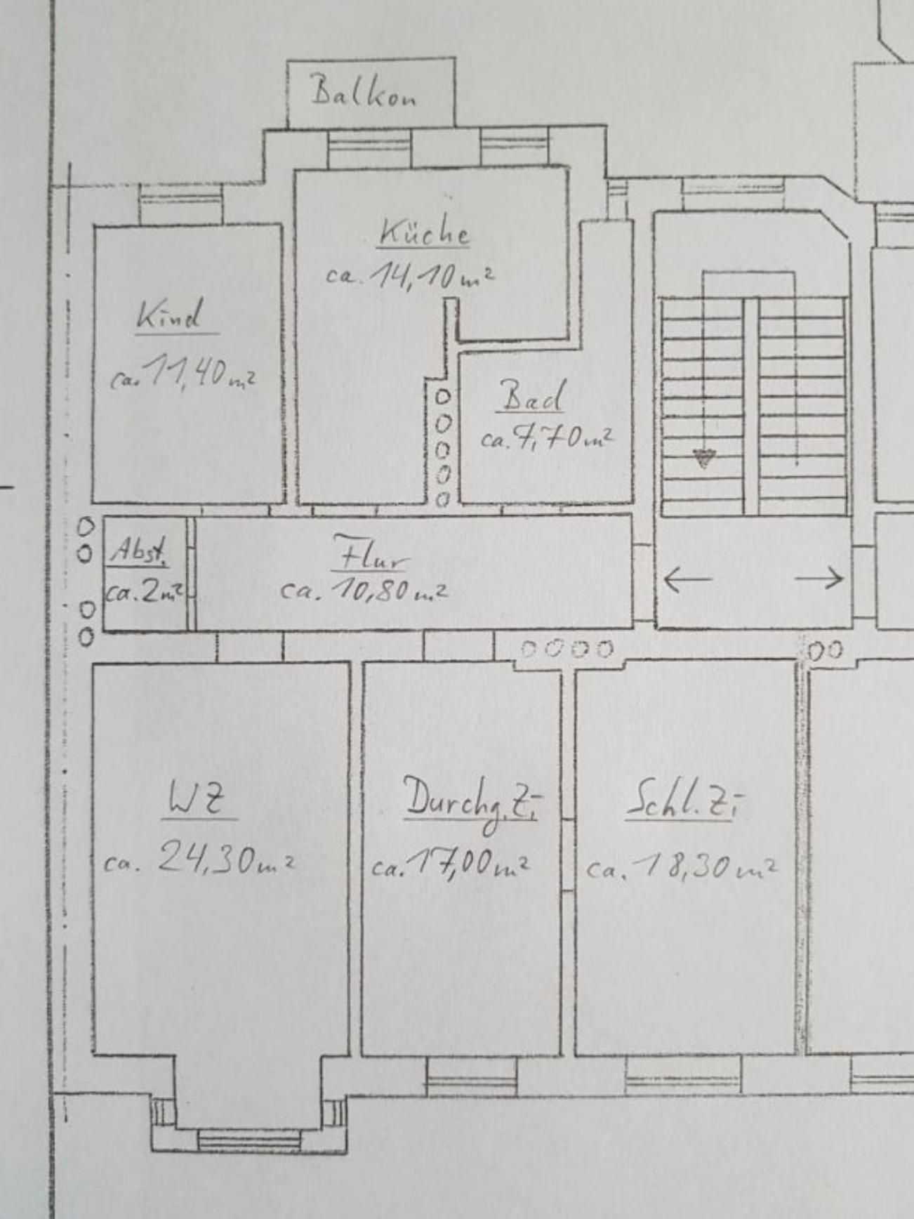 Richtung Süden zum Innenhof liegen Küche mit Balkon, das kleinere Zimmer und das Bad. Richtung Norden liegen die 3 größeren Zimmer mit Isolierfenstern. (ein Durchgangszimmer)