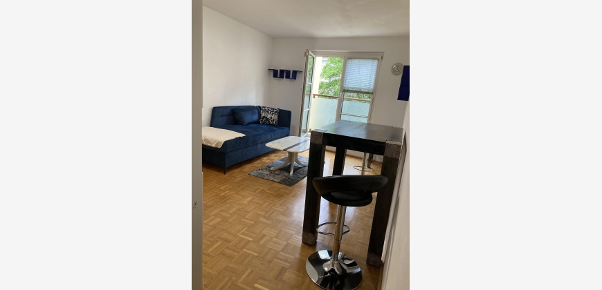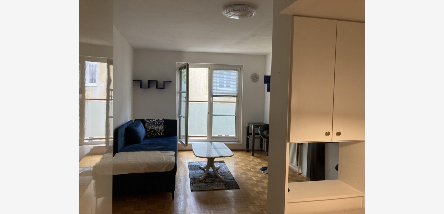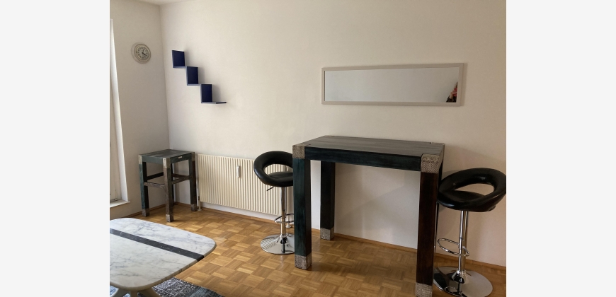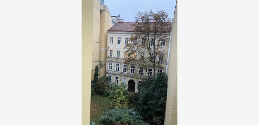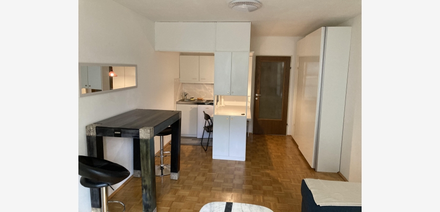 Helle sonnige schmucke neue vollmöbliete 1-Zimmerwohnung mit großem französischen Fenster mit Blick in den begrünten ruhigen Innenhof im 4. Liftstock. Das elegante Haus-Eingangsambiente mit Marmorspiegelwänden führt direkt zum Lift. Vom Vorzimmer betritt man das hochwertig renovierte Badezimmer und neutraler Verfliesung und Waschmaschinenanschluss (im Keller befinden sich Waschmaschine u Trockner). Im Wohn-Schlafzimmer befinden sich der Kochnischen-Verbau, großer neuer Kleiderschrank, neues großes Schlafsofa, neuer Hochtisch mit Hochsesseln u Hocker runden die eigenen 4 Wände ausschließlich für 1-Personen
