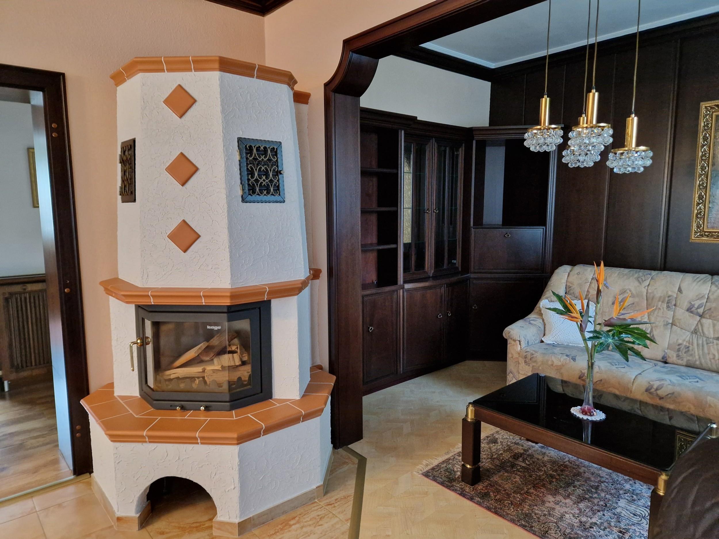 Wohnzimmer: exklusiver Kaminofen und Anschlußmöglichkeit für TV-Gerät