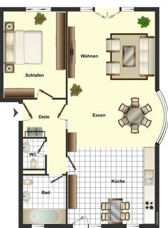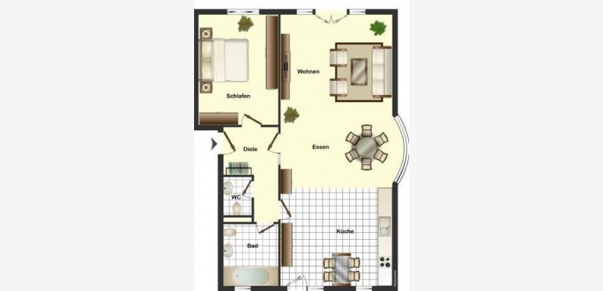 Diele, Wohn-/Esszimmer mit Küche, Schlafzimmer, Bad mit Wanne und WM-Anschluss, separates WC