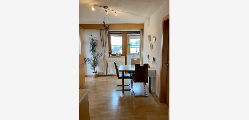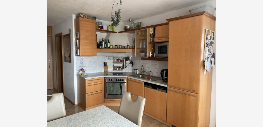 Die 46m² helle, gemütliche Wohnung bietet einen kleinen Vorraum, eine vollausgestattete Küche mit Abstellraum, ein Badezimmer mit Badewanne, WC und Waschmaschine, ein ruhiges Schlafzimmer mit großem Bett, Kommode und Schrank sowie ein lichtdurchflutetes Wohnzimmer mit Couch, Schreibtisch und sonnigem Balkon mit Blick auf die umliegende Bergwelt. Garagenstellplatz und Kellerabteil sind ebenso vorhanden.