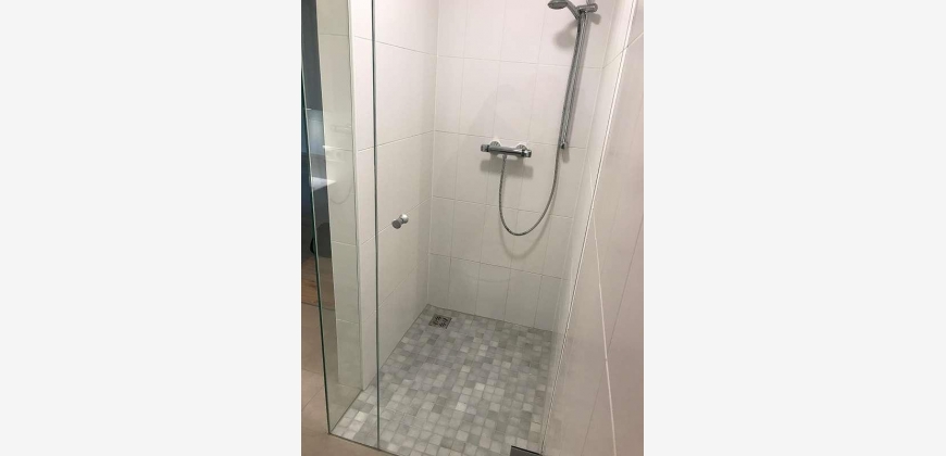 Modernes Badezimmer mit Dusche, WC und Spiegelschrank über dem Waschbecken.