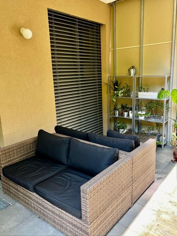 Überdachte Terrasse mit privatem Gartenanteil und Terrassenmöbel.