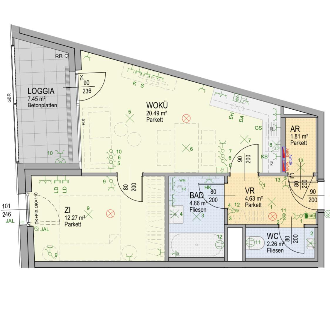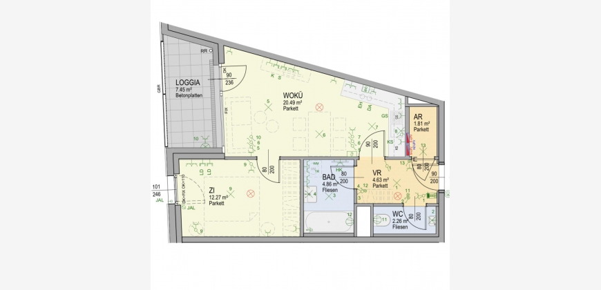 Wohnung besteht aus Vorzimmer, Schlafzimmer, Wohnküche, Abstellraum, Bad, WC, Loggia