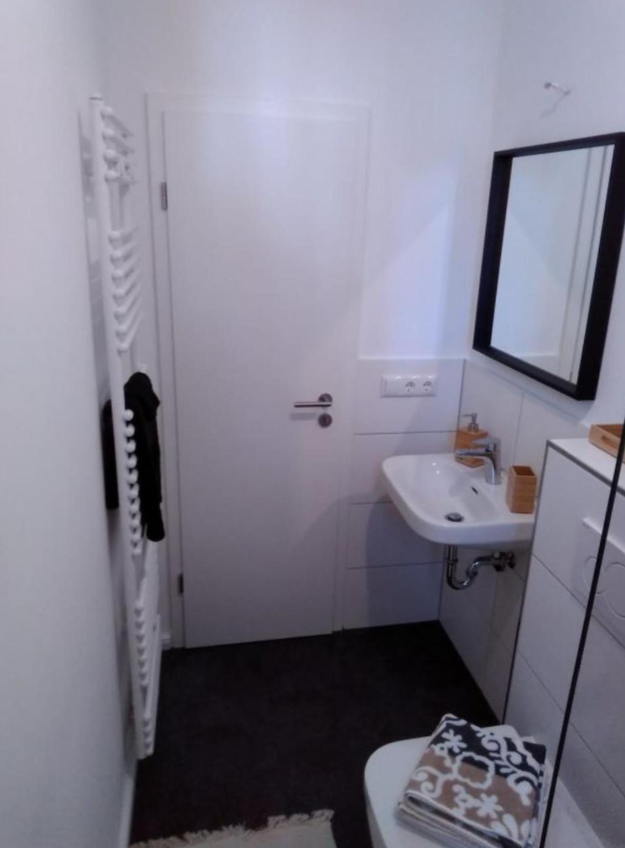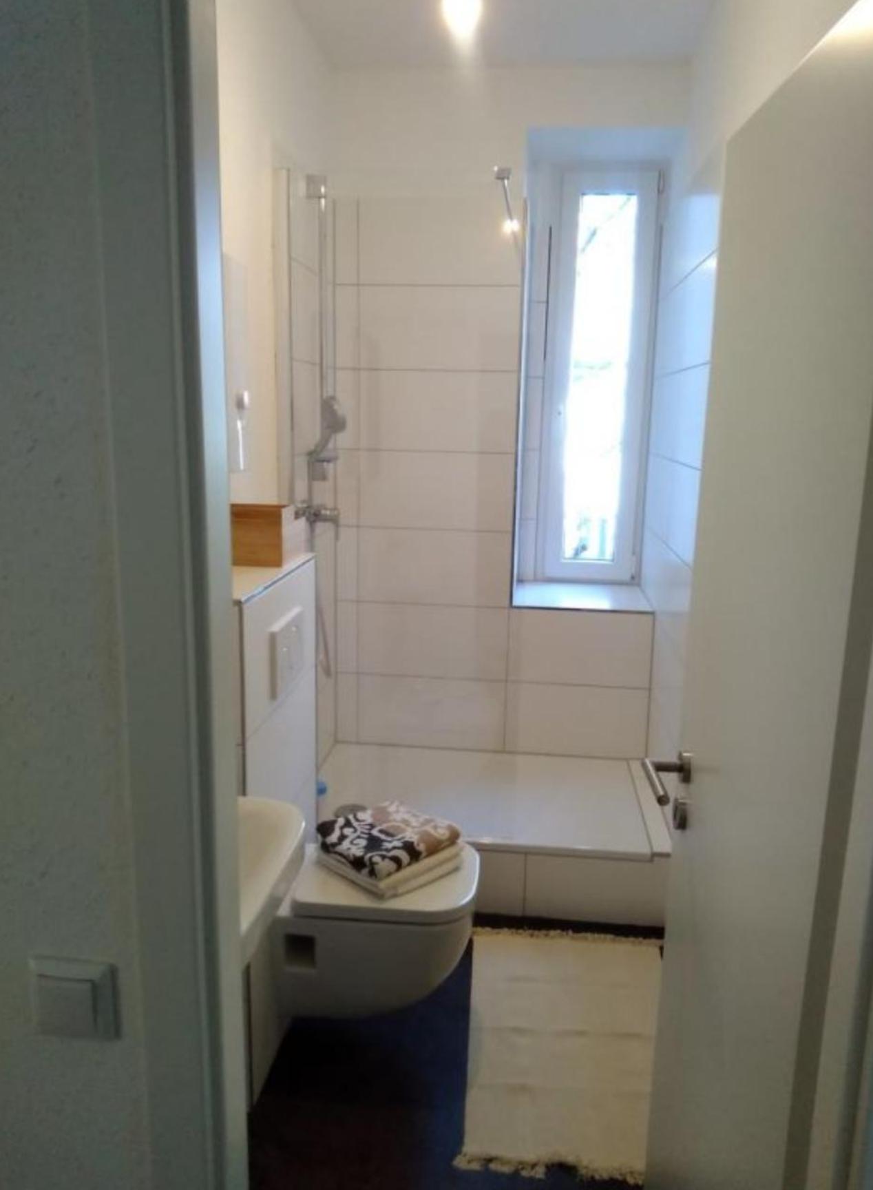 Bad: Wanne und Vorhang, Hänge-WC, Handtuchtrockner