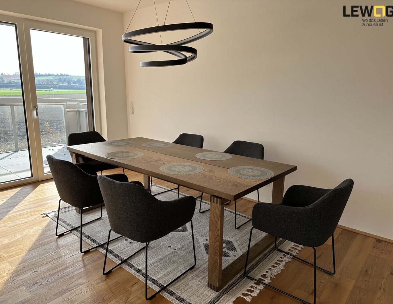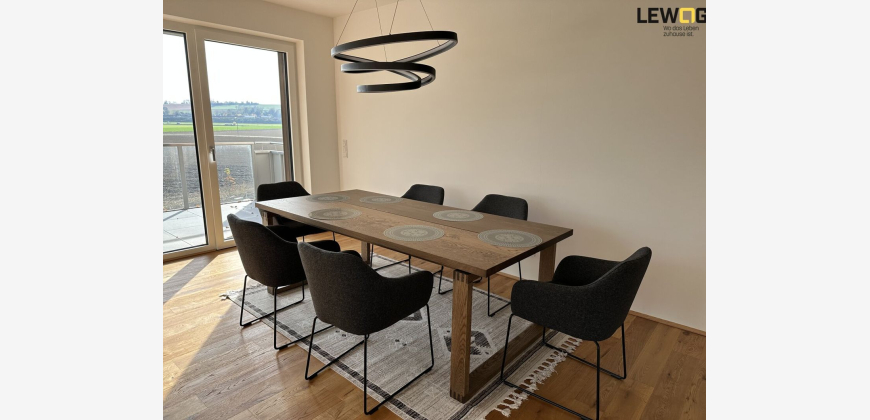 Diese moderne 4-Zimmer-Wohnung im letzten Obergeschoss des 2024 erbauten Wohnhauses überzeugt durch ihren durchdachten Grundriss, hochwertige Ausstattung und die Nähe zum Pichlinger See. Mit dem Lift kommen Sie bequem von der Tiefgarage in Ihre Wohnebene. Sie betreten die Wohnung vom hellen Stiegenhaus über eine kleine Diele mit Platz für eine Garderobe, von hier erreichen Sie die Sanitärbereiche, den Wohnbereich und die 3 Schlafräume. Der helle Wohn-/Essbereich mit stilvoller Landhaus-Küche lädt zum Wohlfühlen und Genießen ein. Die Küche verfügt über cremeweiße Fronten und eine Kochinsel in Richtung Essbereich. Durch den optimalen Grundriss und 2 große Glasfronten wirkt der Wohnbereich sehr geräumig. Vom Wohnbereich blicken Sie ins Grüne oder zum Pichlingersee, über zwei Glastüren betreten Sie den 22 m² großen Eckbalkon Das 8 m² große Badezimmer ist mit eleganten mattweißen Fliesen, einer flachen Dusche, Badewanne, Doppelwaschtisch und Waschmaschinenanschluss ausgestattet, das separate WC verfügt über ein Handwaschbecken. Elektrische Rollläden in den Schlafräumen und Raffstores im Wohn/Essbereich sowie eine zentrale Wohnraumlüftung sorgen für Komfort und ein angenehmes Raumklima. Fliegengitter halten Insekten fern. Der Wohnbereich ist mit einem neuen Tisch und Sesseln, sowie einer Ledercouch ausgestattet