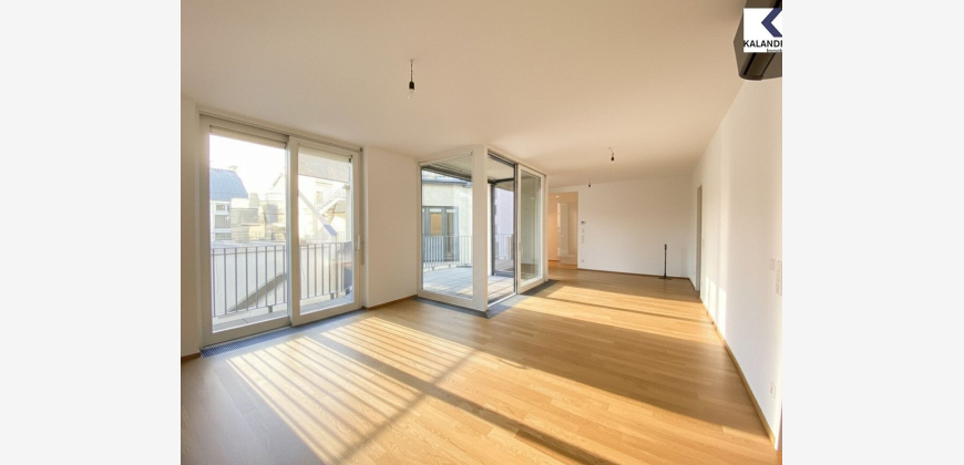 Vorraum, großer Wohnraum mit Zugang zu einer Terrasse + Loggia, Küche mit Zugang zu einem Abstellraum + Waschmaschinenanschluss, Schlafzimmer mit zugeordnetem Wannenbad + WC und Zugang zu der zweiten Terrasse, weiteres Schlafzimmer mit zugeordnetem Duschbad und begehbaren Schrankraum und ein separates WC. Ausstattung: