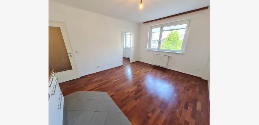 ca. 42 m² Wohnfläche bestehend aus: Wohnzimmer mit offener Einbauküche, extra kleines Schlafzimmer, Vorraum, Bad mit Wanne (inkl. Anschluss für Waschmaschine), extra WC. Kellerabteil.